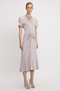 Presented in delicate Heather, the Gathered Waist Midi Dress is a house favourite delivering a professional and polished aesthetic. A waist and hip-hugging cut offers a flattering and forgiving silhouette while a pleated detail at the waist and V-shape back waist seam add sensuous talking points. Finished with a lined bodice and skirt, it also has exposed seams and a contrasting topstitch. Styled with the High Heel Size & Fit - Fits true to size, take your regular size - Fitted around the waist and hip - The model height is 5'10''/179cm and is wearing a size 6 Product Details - Midi length - Round front neckline, v-shape back neckline - Pleat detail on front waist - V-shape back waist seam - Exposed seams and contrast topstitching details - Concealed zip with hook and eye closure at back - 100% Crepe back satin - Dry clean only - Made in Portugal