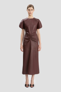 Gathered Waist Midi Dress In Soft Burgundy Leather