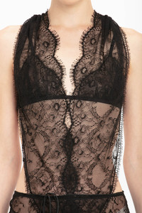 Sophisticated and sexy, the Halter Neck Lace Bodysuit in Black is delicately crafted from chantilly lace with scalloped detailing. Fully lined in a sheer plain tulle with a slight stretch, it has ties at the waist and back neck for added comfort. Decorative features include a gathered detail from the shoulder point through the front body and a light gathering across the back pant. Styled with the Lace Pencil Skirt Size & Fit - Fits true to size, take your regular size - The model height is 5'10''/179cm and is wearing a size 6 Product Details - Chantilly lace fabric with scallop detail - Fully lined with sheer plain tulle with slight stretch - Gathering front detailing - Light gathering across back pant - Waist ties and back neck ties - Armhole straps - Gusset insert - 60% Viscose 40% Polyamide - Dry clean only - Made In United Kingdom