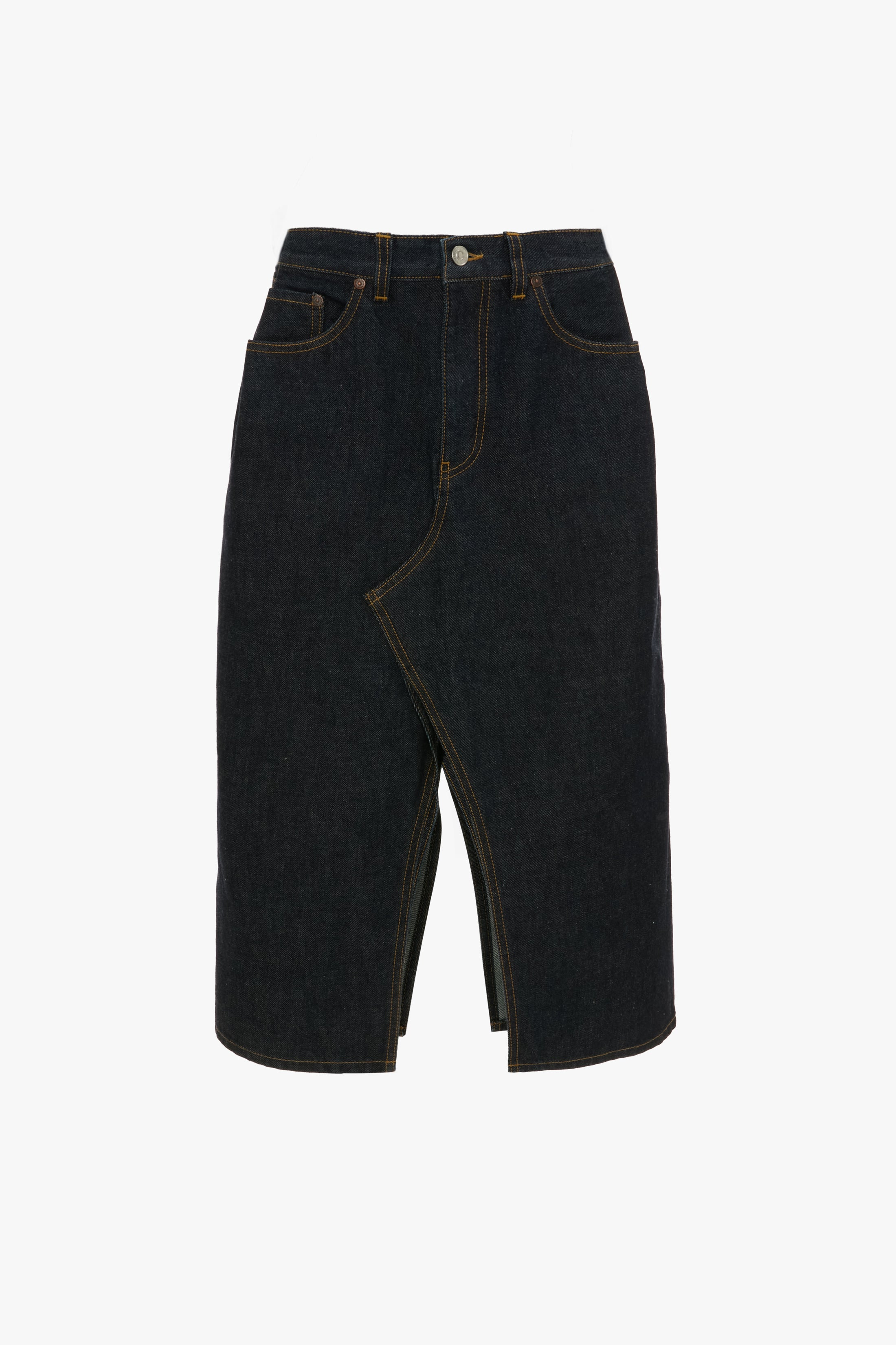 Blending feminine and utilitarian references, the Kick Pocket Denim Skirt has a contemporary sophistication. A low-rise waist imbues it with an off-duty attitude, while a pleated detail at the pockets and front and back splits inject a seductive undertone. Crafted from a non-stretch, mid-weight indigo denim in a Light Rinse, it is finished with a branded leather patch and tobacco topstitching. Size & Fit - Fits true to size, take your regular size - The model height is 5'11’’/180cm and is wearing a size 25 Product Details - Indigo denim, pleat detail midi skirt - Mid rise - Non-stretch indigo mid-weight denim with light rinse - Front and back splits - Branded leather patch on right back waistband - 100% Cotton - Machine wash at 30C - Made in Italy