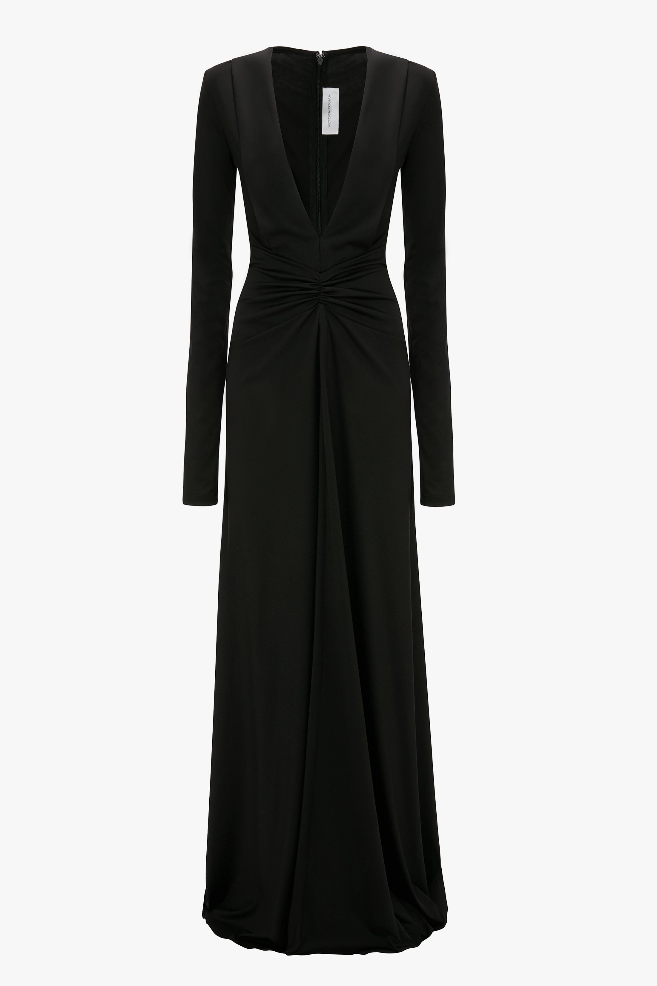 A plunging neckline and floor-pooling hemline give the Long Sleeve Deep V-Neck Gown in Black dramatic flair. Crafted from stretch jersey for a body-skulpting effect, it has elegant long sleeves, a V-shape waist seam and tactile front ruching. Expressive but understated, it perfectly reflects the house’s refined sophistication. Styled with the 202 Clutch Size & Fit - The model height is 5'11"/180cm and is wearing a size 6 Product Details - Stretch jersey fabrication - Low plunge v neckline - V shape waist seam with centre front ruching - Full length gown - Centre back invisible zip - Fits true to size, take your regular size - 90% Polyester 10% Elastane - Dry clean only - Made in Portugal