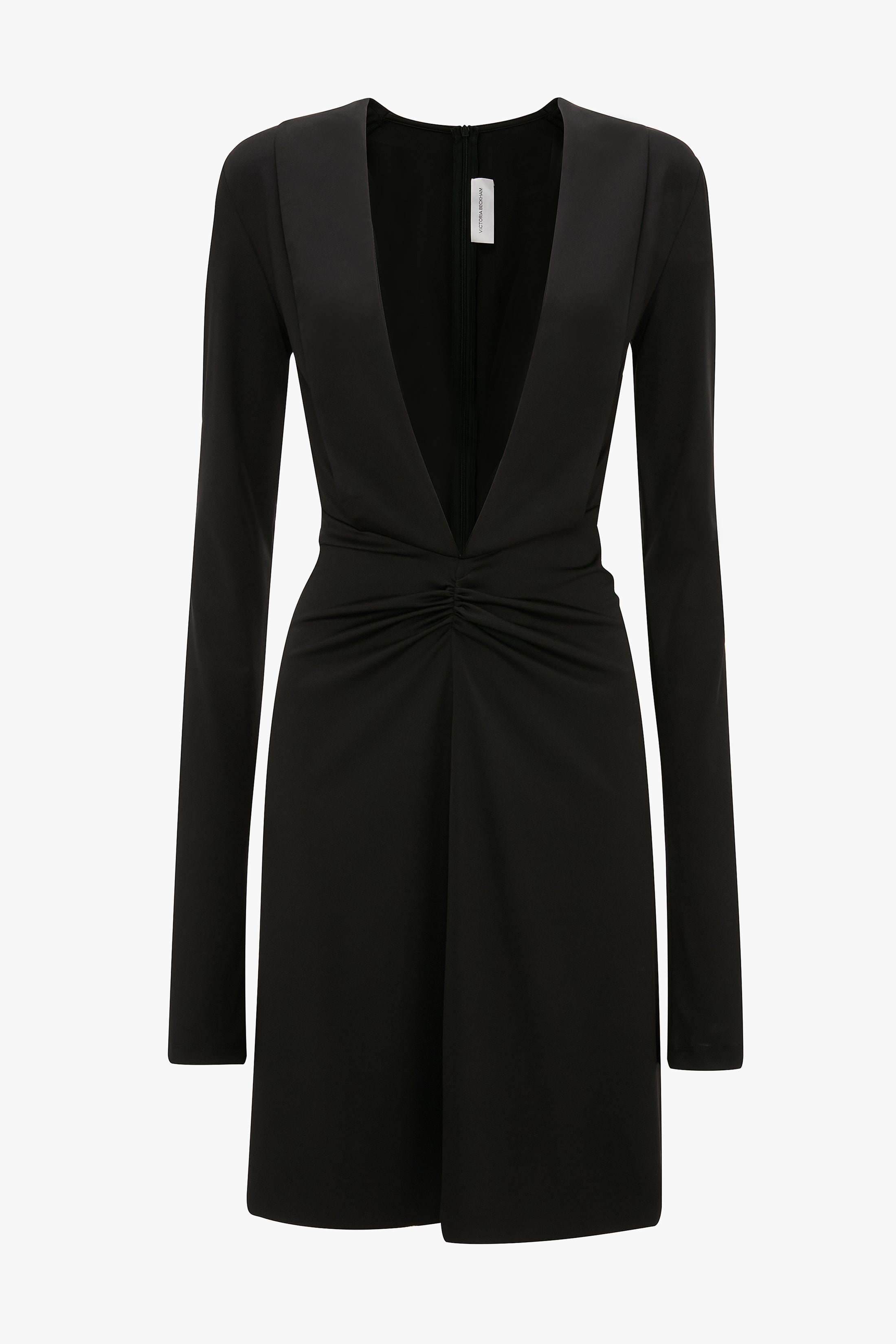 The traditional LBD is reconsidered with a daring plunge neckline in the Long Sleeve V-Neck Mini Dress. Crafted from stretch jersey for a body-skimming silhouette, it has modest long sleeves and a playfully high hemline, imbuing it with a polished and provocative personality. Finished with a V-shape seam at the waist and front ruching, it marries classic and contemporary references beautifully. Styled with the Harlow Stiletto Sandal Size & Fit - Fits true to size, take your regular size. - The model height is 5'11"/180cm and is wearing a size 6 Product Details - Stretch jersey - Low plunge v neckline - V shape waist seam with ruching - Mini length - Long sleeve - 90% Polyester 10% Elastane - Dry clean only - Made in Portugal