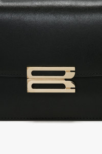 Designed in London and crafted in Italy, the Mini Dorian Bag in smooth black leather is a refined proposition for everyday use. It has a removable ‘smart strap’ with snap buttons for versatile styling as a shoulder, crossbody or clutch bag and an attractive top handle. Showcasing the house’s signature gold branding, which includes the discretely stamped address of Victoria’s London studio (N.202) followed by a unique serial number, the Mini Dorian is finished with tactile microsuede lining, an internal double compartment and small internal flat leather pocket. Size & Fit - Height: 16.5cm, Width: 25cm, Depth: 8.5cm, Drop (long length): 51cm, Drop (short length): 35cm Product Details - The smart strap has snap buttons that easily allows length of strap to be changed; can be worn on the shoulder or across the body - Internal double compartment - Small internal flat leather pocket - Features our signature gold branding with VB logo and a unique code - Shiny calf - Microsuede lining - 100% Calf leather - On calf leathers, regularly apply a small amount of nourishing cream and buff gently using a cloth - Made in Italy