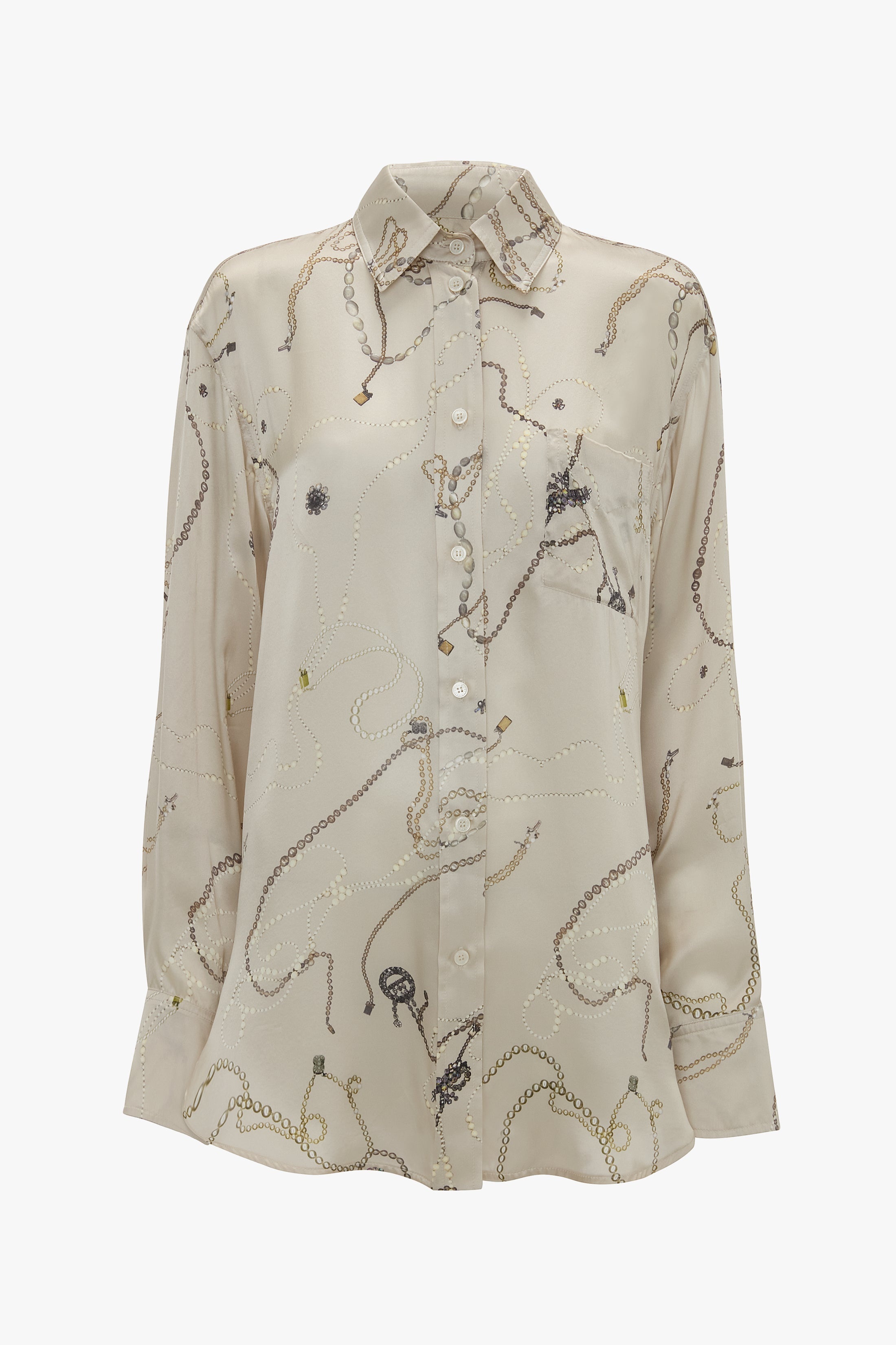 Inspired by the comfort and ease of loungewear, the Pyjama Shirt is an elevated take on an everyday item. Reinvented in luxurious silk for a premium aesthetic, the Pyjama Shirt has a softly structured silhouette with a collar neckline, front-button fastening and button cuff. An attractive jewellery print brings a feminine point of difference to the shirt’s boyish undertone. Styled with the Pyjama Trouser & Sloan Mule Size & Fit - For a more fitted look, take one size down - The model height is 5'10''/178cm and is wearing a size 10 Product Details - Seasonal print - Chest pocket - Front button fastening - Button cuff - Collar neckline - 100% Silk - Dry clean only - Made in Portugal