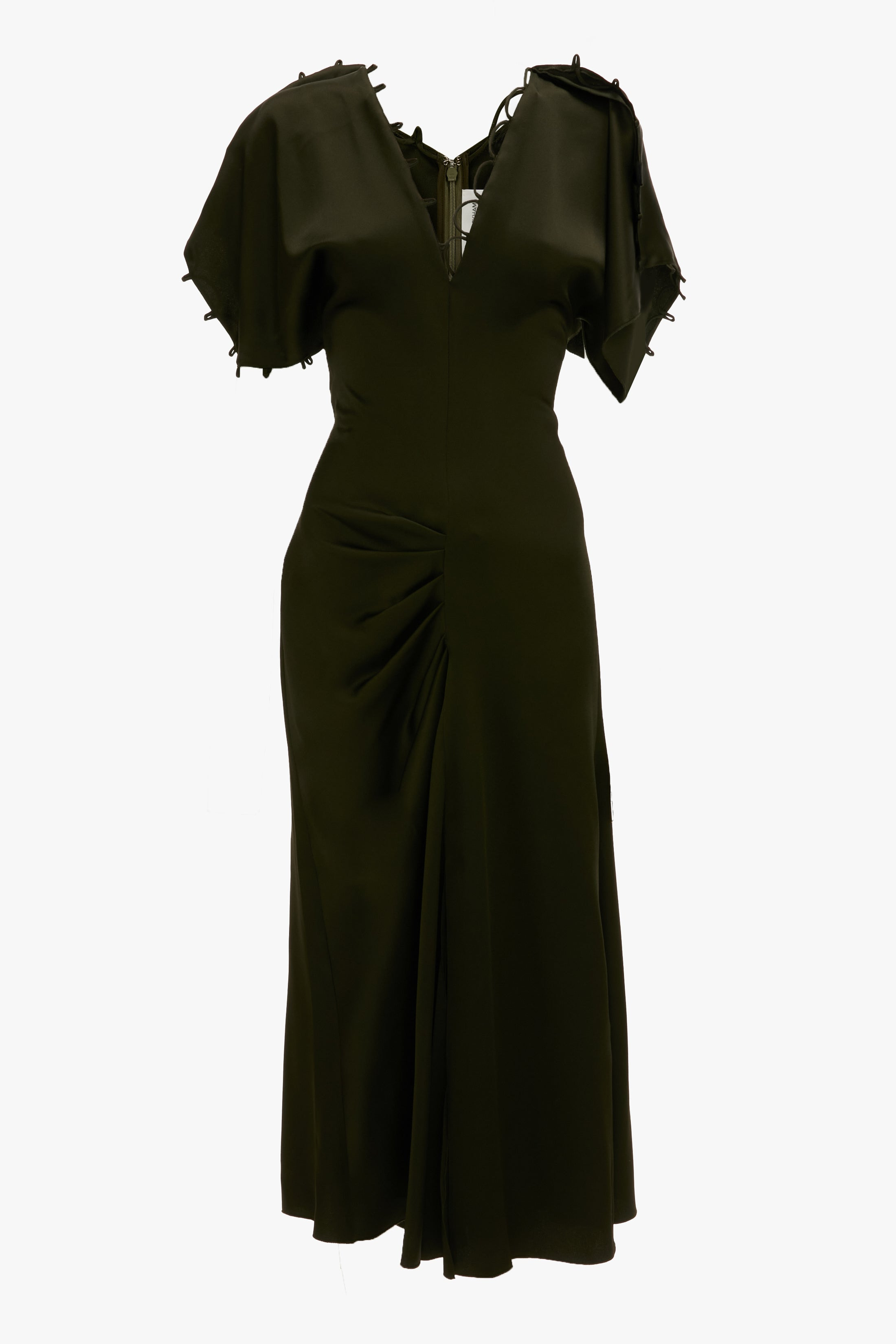 Crafted from crepe back satin, the Rouleaux Detail Midi Dress is distinguished by a refined rouleaux detail at the draped sleeves and V neckline. Fitted at the bodice, waist and hip, with a pleat detail on the skirt skirt and asymmetric hemline, it has a sophistication rooted in modern femininity. Presented in Dark Olive, it marries contemporary and classic design codes. Size & Fit - Fitted through bust, waist and hip - Style is fitted through the body, customers in between sizes may wish to size up - The model height is 5'11’’/180.5cm and is wearing a size 6 Product Details - Crepe back satin, draped, rouleau detail midi dress - V-neckline - Draped sleeves with rouleau detail at sleeve hems and neckline - Asymmetric hem with centre front split detail - 71% Acetate 29% Viscose - Dry clean only - Made in Portugal