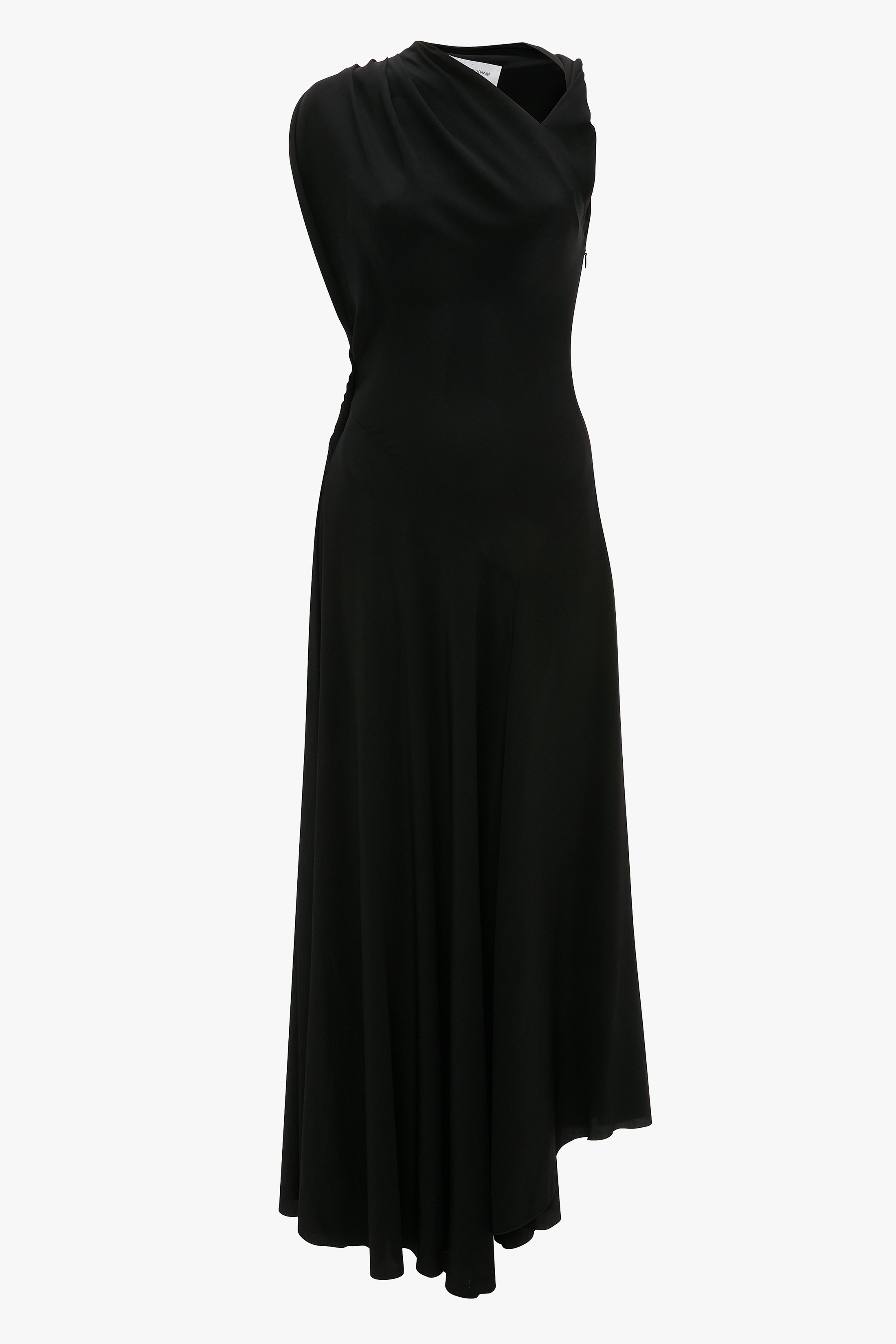 An asymmetric neckline and hemline give the Sleeveless Draped Midi Dress a directional silhouette, while a fitted waist maintains a feminine sensibility. A pleated shoulder and twisted detail at the front neckline and side seam add tactile talking points. Presented in classic Black, it is a sophisticated proposition for the new season. Styled with the Harlow Stiletto Sandal Size & Fit - Fits true to size, take your regular size - Fitted at the waist - The model height is 5'11"/180cm and is wearing a size UK 6 Product Details - Asymmetric design - Pleat shoulder detail - Twist details at front neckline and side seam - 100% Silk - Dry clean only - Made in Portugal