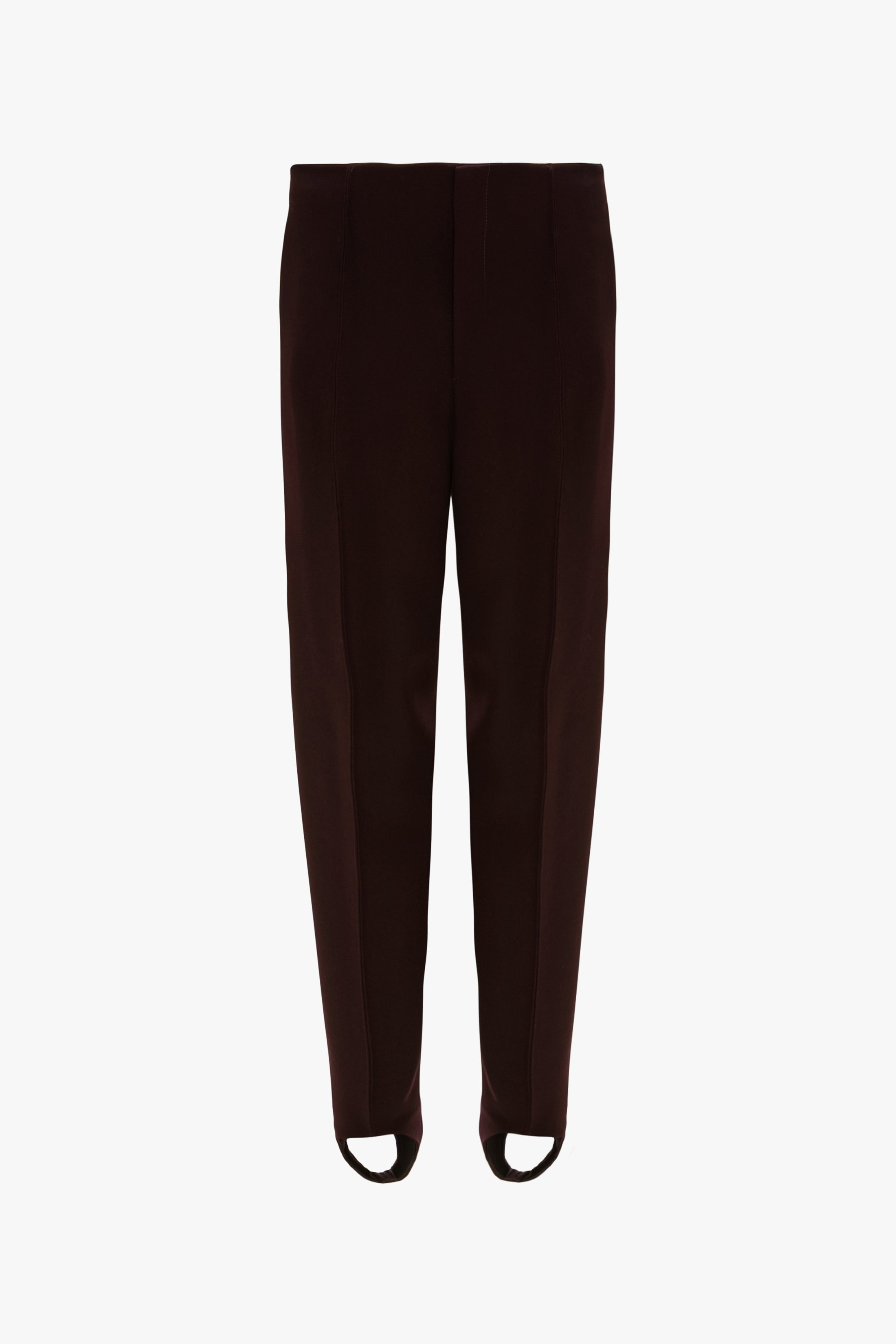 Elevating athleisure wear design codes, the Slim Sculptural Trouser in Deep Mahogany is a formal trouser with equestrian stirrup detail, offering a contemporary twist on traditional tailoring. Adjustable to allow for different leg lengths, the stirrup is elasticated for absolute comfort. A double wool crepe fabrication and front and back darts give the trouser its streamlined cut, which is enhanced by slick side seam pockets. Size & Fit - Fits true to size, take your regular size - The model height is 5'11’’/180cm and is wearing a size 6 Product Details - Mid rise - Side seam pockets - 100% Wool - Dry Clean Only - Made in Lithuania