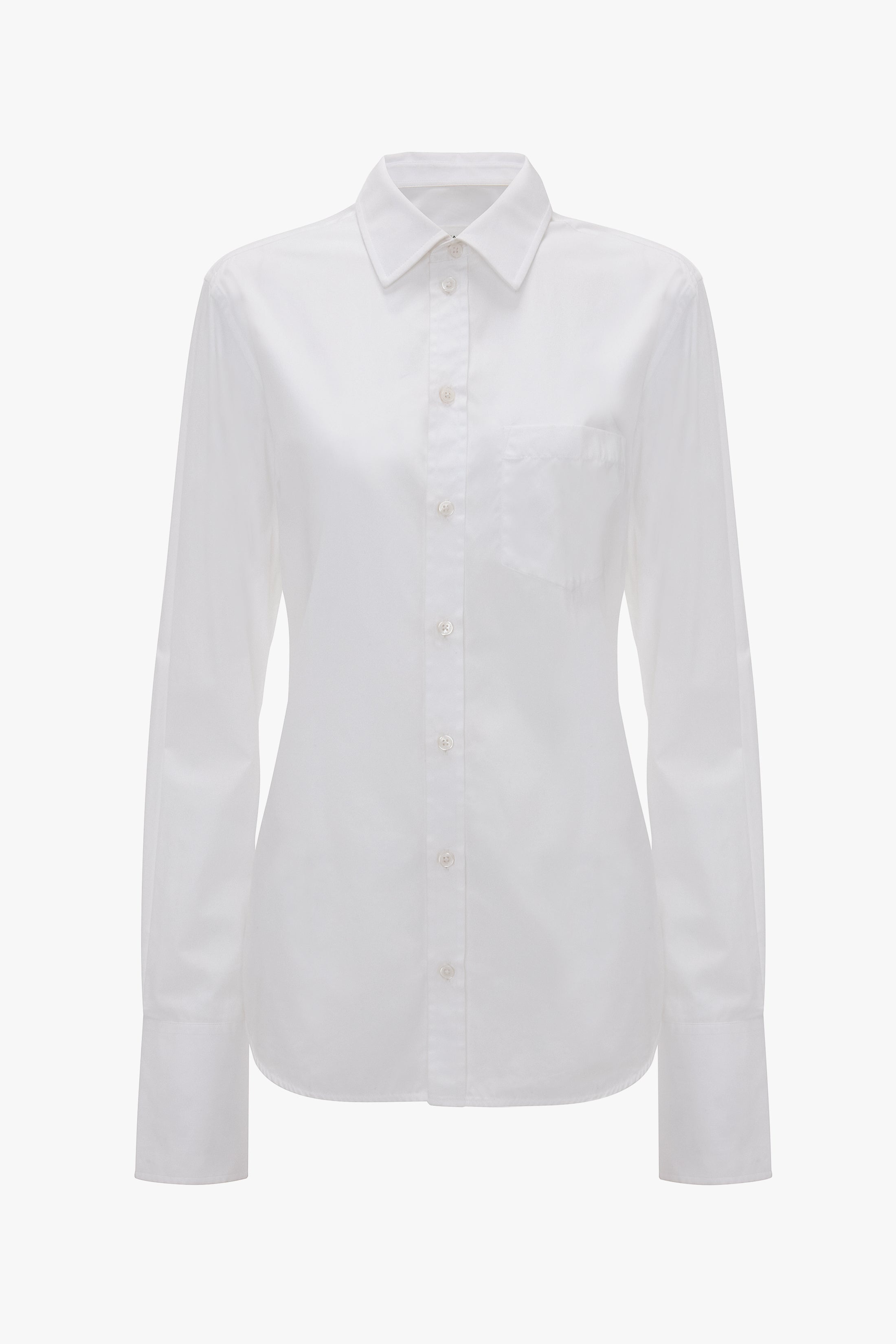 Made from 100% cotton, the Tab Detail Shirt is a wardrobe classic updated with considered design details. A martingale at the back of the waist adds subtle definition to the silhouette and creates an attractive visual feature, while an embroidered Victoria Beckham logo in a contrasting thread elevates the look further. A traditional collar, front-button fastening and chest pocket reference its masculine tailoring roots. Styled with the Cropped Trouser, Polo Neck & Sloan Mule Size & Fit - The model height is 5'10''/178cm and is wearing a size 8 - Fits true to size, take your regular size Product Details - Light cotton fabric - Chest pocket - Front button fastening - Button cuff - Collar neckline - VB embroidery in contrast thread - Back waist martigale detail - 100% Cotton - Dry clean only - Made in Turkey