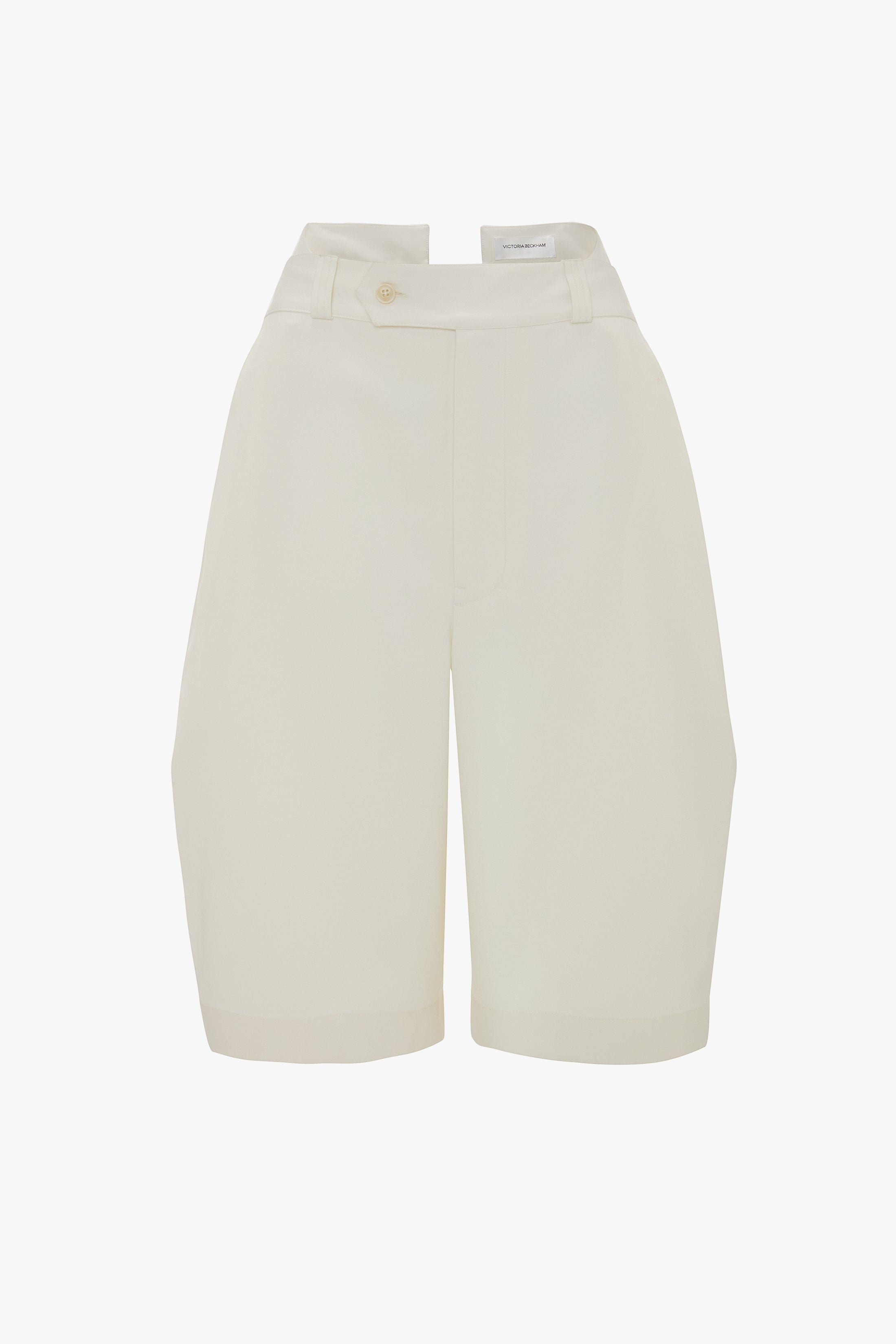 The Tab Detail Shorts reflect the house’s sophisticated blending of masculine and feminine. With a below-the-knee hemline and side pockets inserted into the seam, they have a contemporary boyish undertone. A high-rise waistline at the back and front pleats add femininity to the silhouette, while a front waistband tab with button fastening adds further shape. Crafted in a wool blend, they have an adjustable tab detail with contrast stitched button at the back. Styled with the Tab Detail Shirt, Polo Neck & Sloan Mule Size & Fit - High rise. Designed for the back to sit higher than the front - Shorts end below the knee - Fits true to size, take your regular size Product Details - Fresh wool fabrication - Front pleat detail - Front waistband tab with button fastening - 50% Wool 50% Polyester - Dry clean only - Made in Portugal