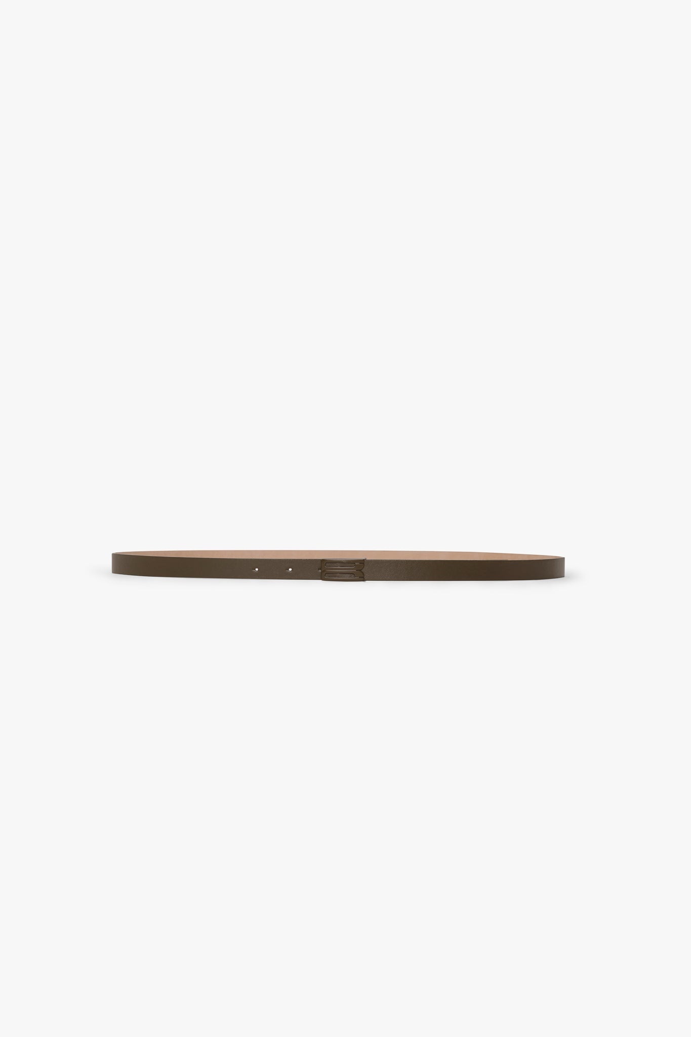 Understated refinement is a hallmark of the Victoria Beckham brand and it’s embodied in the Tonal Micro Frame Belt. With its streamlined silhouette, smooth, tactile calf leather fabrication and tonal matte finish on the B Frame hardware, it will add a polished finishing touch to utilitarian separates and masculine tailoring. Presented in Dark Khaki, it is a foundational piece for any wardrobe. Size & Fit - Small: 70cm, Width: 20mm - Medium: 80cm, Width: 20mm - Large: 90cm, Width: 20mm - Xlarge:100cm, Width 20mm Product Details - Signature B frame hardware with new matt tonal finish - Shiny calf body - 100% Calf Leather - On calf leathers, regularly apply a small amount of nourishing cream and buff gently using a cloth - Made in Italy