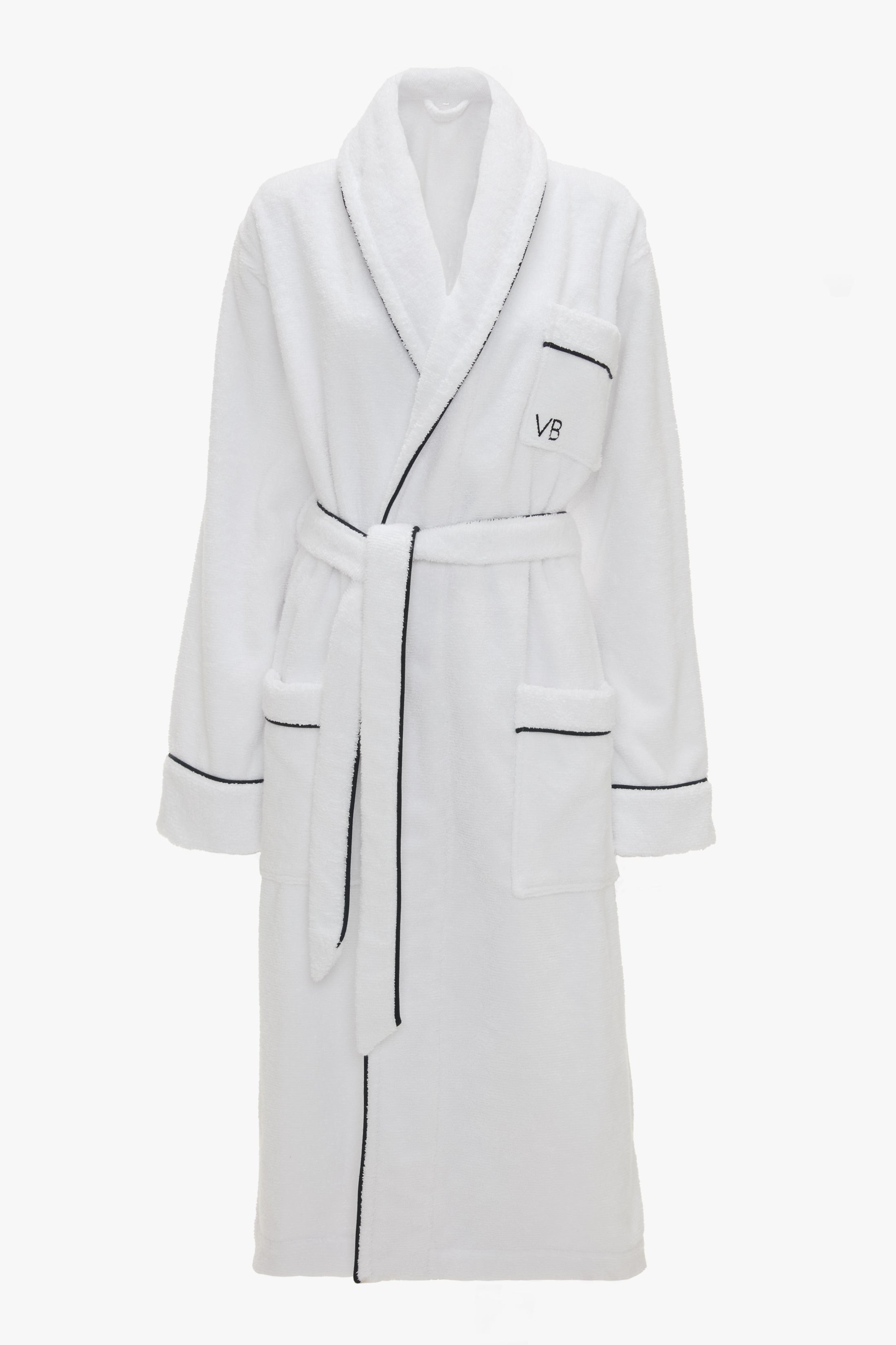 Discreet piping in contrasting navy brings an elevated point of difference to the Towelling Robe in White. Made from super-soft 100% cotton for absolute comfort, it has a mid-length hemline, lower patch pockets and a wrap-style belt. A single chest pocket is adorned with the house’s signature Victoria Beckham monogram. Size & Fit - Fits true to size, take your regular size Product Details - Mid length robe - Wrap belt fastening - Contrast navy piping