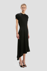 Crafted from crepe back satin for a flattering drape, the Twist Shoulder Dress in classic Black is distinguished by tactile short twisted sleeves and a front tie detail. A round front neckline, V-shape back and asymmetric mid-length hemline add understated elegance. - Midi length with asymmetric hem - Drape fabrication - Round front neckline - V-shape back - Short twisted sleeve - Tie detail - 71% Acetate 29% Viscose - Dry clean only - Made in Portugal SIZE & FIT - Fits true to size, take your normal size - The model height is 5’9”/175cm and is wearing a size 6