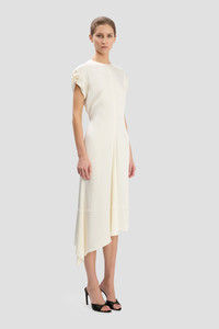 Crafted from crepe back satin for a flattering drape, the Twist Shoulder Dress in romantic Ivory is distinguished by tactile short twisted sleeves and a front tie detail. A round front neckline, V-shape back and asymmetric mid-length hemline add understated elegance. - Midi length with asymmetric hem - Drape fabrication - Round front neckline - V-shape back - Short twisted sleeve - Tie detail - 71% Acetate 29% Viscose - Dry clean only - Made in Portugal SIZE & FIT - Fits true to size, take your normal size - The model height is 5’11”/180cm and is wearing a size 6