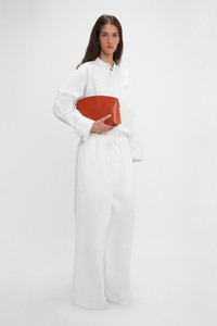 New to the Victoria Beckham leather goods edit, this glossy calf leather Clutch Bag is a favourite of Victoria’s. Presented in a tactile shade of Tan, it has a sleek silhouette with structured body and softly rounded top. It also introduces a new hardware language to the brand’s leather goods edit, with a branded padlock serving as zipper and closure and a snap button at one side to hold the zip tail in place. Leather panels stitched to form a V shape add visual interest, while a tactile textile lining adds a sumptuous finishing touch. Styled with the Bib Front Tuxedo Shirt and Drawstring Pyjama Trouser Size & Fit - Width: 28cm, Height: 18.7cm, Depth: 9cm Product Details - Textured shiny calf leather - Structured with a curved shape opening - Flat pocket in the main inner compartment - Snap button on the side to hold the zip tale in place - Engraved VB branded padlock mechanism at closure - 100% Calf Leather - On calf leathers, regularly apply a very small amount of nourishing cream and buff gently using a cloth. Colourless cream should help avoid staining. - Made in Italy