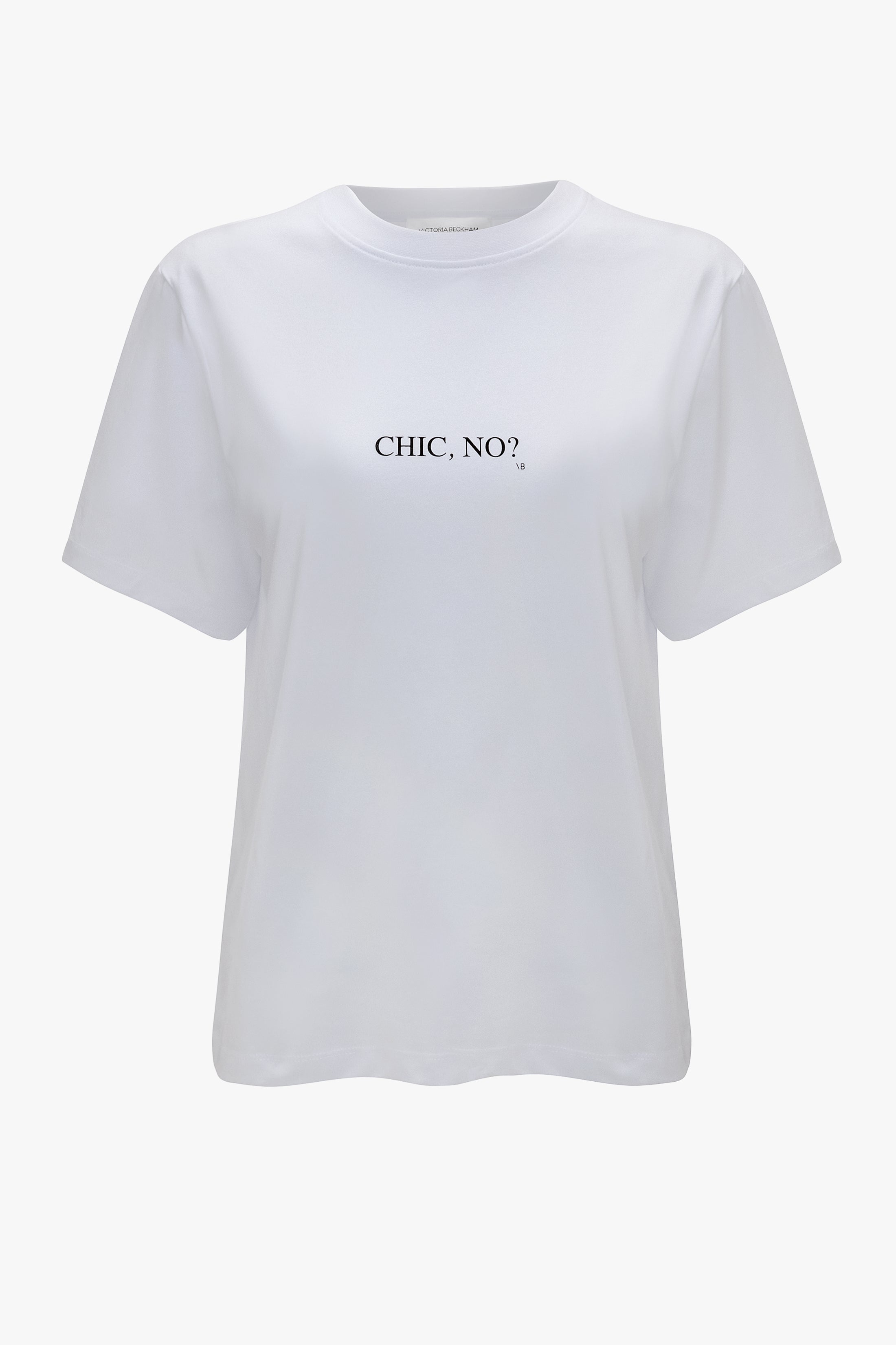 With a relaxed but refined silhouette, the Classic Fit Slogan T-Shirt is an elevated wardrobe essential. Crafted from 100% organic cotton for a tactile finish, it has an embroidered Victoria Beckham logo at the back of the neck and a playful but subtly placed logo at front chest that reads Chic No? Styled with the Bernie Jean, Harlow Stiletto Sandal & Frame Belt Size & Fit - The model height is 5'11"/180cm and is wearing a size XS Product Details - Classic Victoria Tee fit - VB branding at centre back neck - Fits true to size, take your regular size - 100% Organic Cotton - Made in Portugal