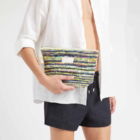 Keep things organized responsibly with the eco-friendly unisex Pamboo beach pouch, made from recycled fabric off-cuts. Packed in a suitcase or shown off on a beach bag, the fashionable look of its hand-woven textured this fabric the accessory of the summer. It closes with a zip decorated with a pompom and the Vilebrequin logo. - Closed by a zipper - External bias and Vilebrequin logo washable leather - Combine a weaving method based on ancestral Moroccan "know-how" and the recycling of our swimsuit materials - Pictures may differ from actual product. Each pouch is unique - Sizes: 23 cm X 16 cm - Recycle material - Unisex Beach pouch Eco-Friendly - Solid Unisex Beach pouch Eco-Friendly - 100% Textile