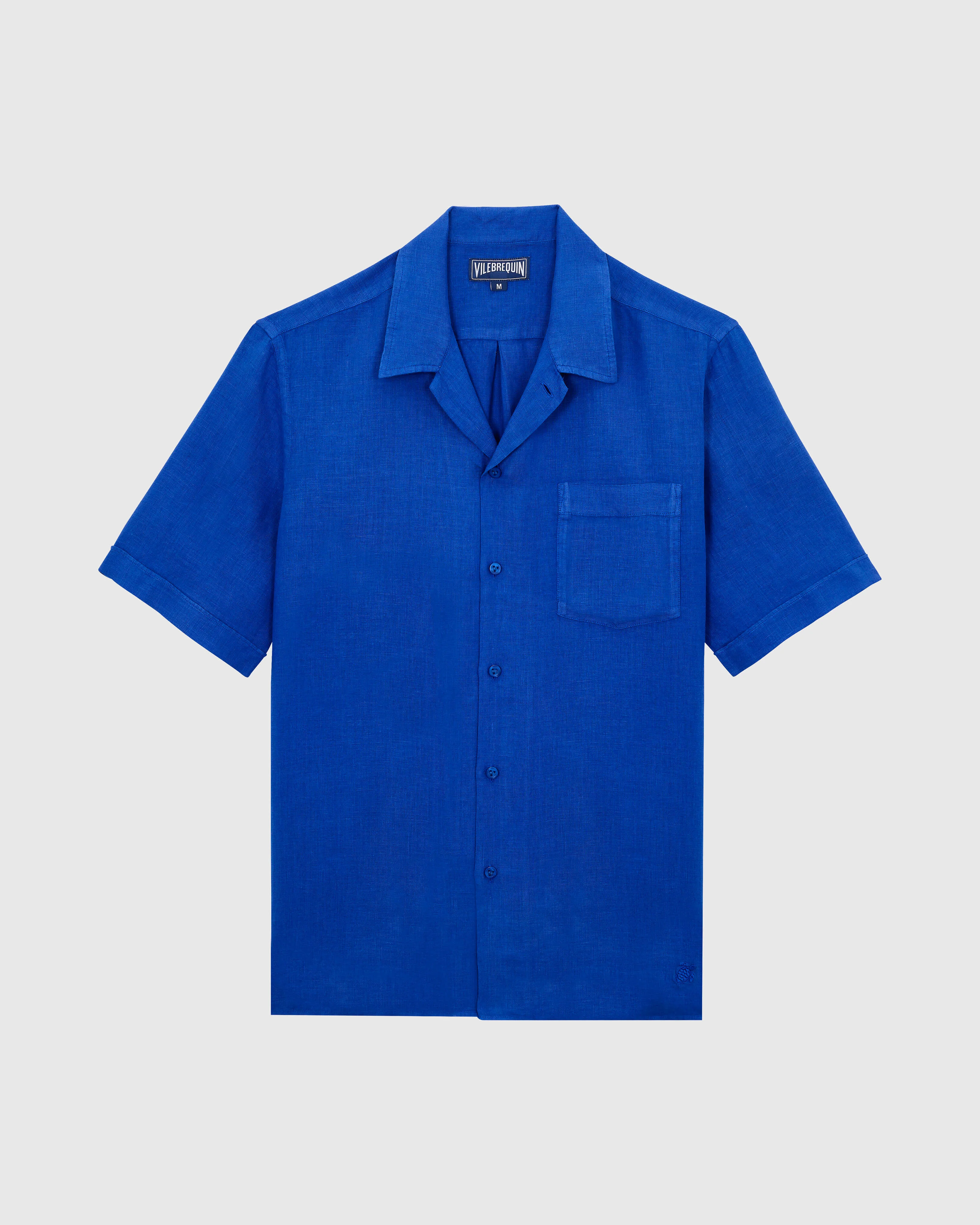 This men's shirt combines a relaxed bowling fit with short sleeves and colours in chic, elegant tones. - Bowling shirt - Short sleeves with turned back cuffs - Chest pocket - Two slots on each side - Embroidered turtle tone-on-tone on the bottom left - Button fastening - Men Shirt - 100% Linen Product Information Style: Charli Model: HARH9U10-613 Color: MARRAKECH / BLUE