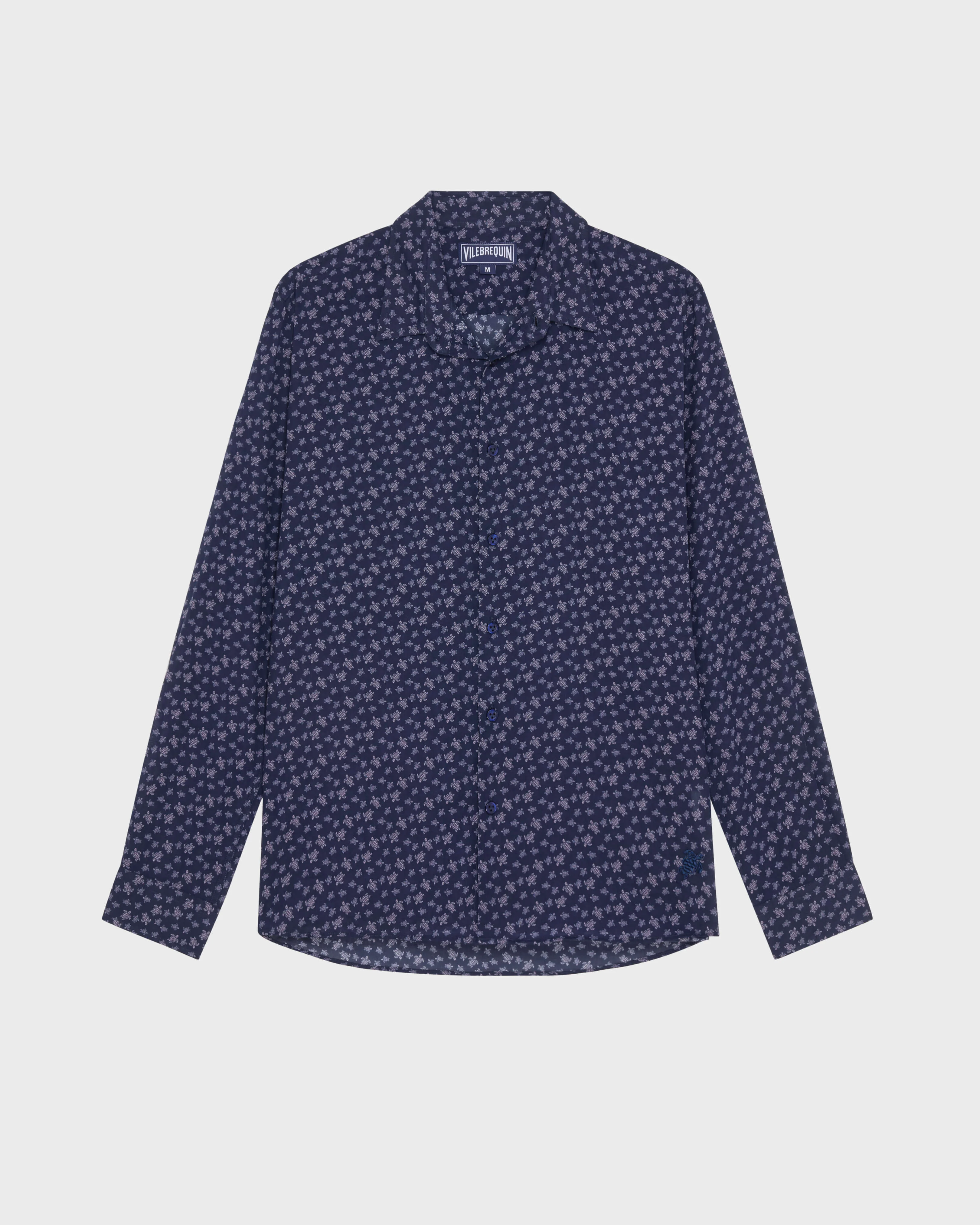 Product Detail 100% organic cotton Evoking the sophistication of the Riviera, this shirt is printed all-over in Ronde des Tortues print with the iconic turtle embroidered on the hem. Organic cotton voile ensures a cool, flattering fit. - Unisex Slim fit Cotton Voile button down shirt for men and women - Long Sleeve - Custom engraved Vilebrequin buttons - Tone on tone embroidery turtle Logo on left hip - Middle back length for a size M: 30.31" - The model is 6'0" and wears a M size - Men Shirt - Men Shirt Micro Ronde Des Tortues Care To take care of your Shirt we advise you to follow our suggestions below: - Wash at 30'C, with similiar colors - Dry line in the shade - Do not bleach - Do not tumble dry - Iron at medium temperature - Gentle cleaning with PCE