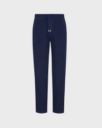 With its supple lines, the Pacha plain men's trousers are ideal for daywear as well as evenings out. Made from high quality linen, they have an elasticated waistband trimmed with a tone-on-tone drawstring with metal tips. In a casual cut, they have two slanted side pockets and one back pocket with flap. - Elastic waistband with cotton drawstring and metal tips - Two italian pockets and one back pocket with Velcro flap - Men Pants - Solid Pants - 100% Linen Product Information Style: Pacha Model: PACP613P-390 Color: NAVY / BLUE