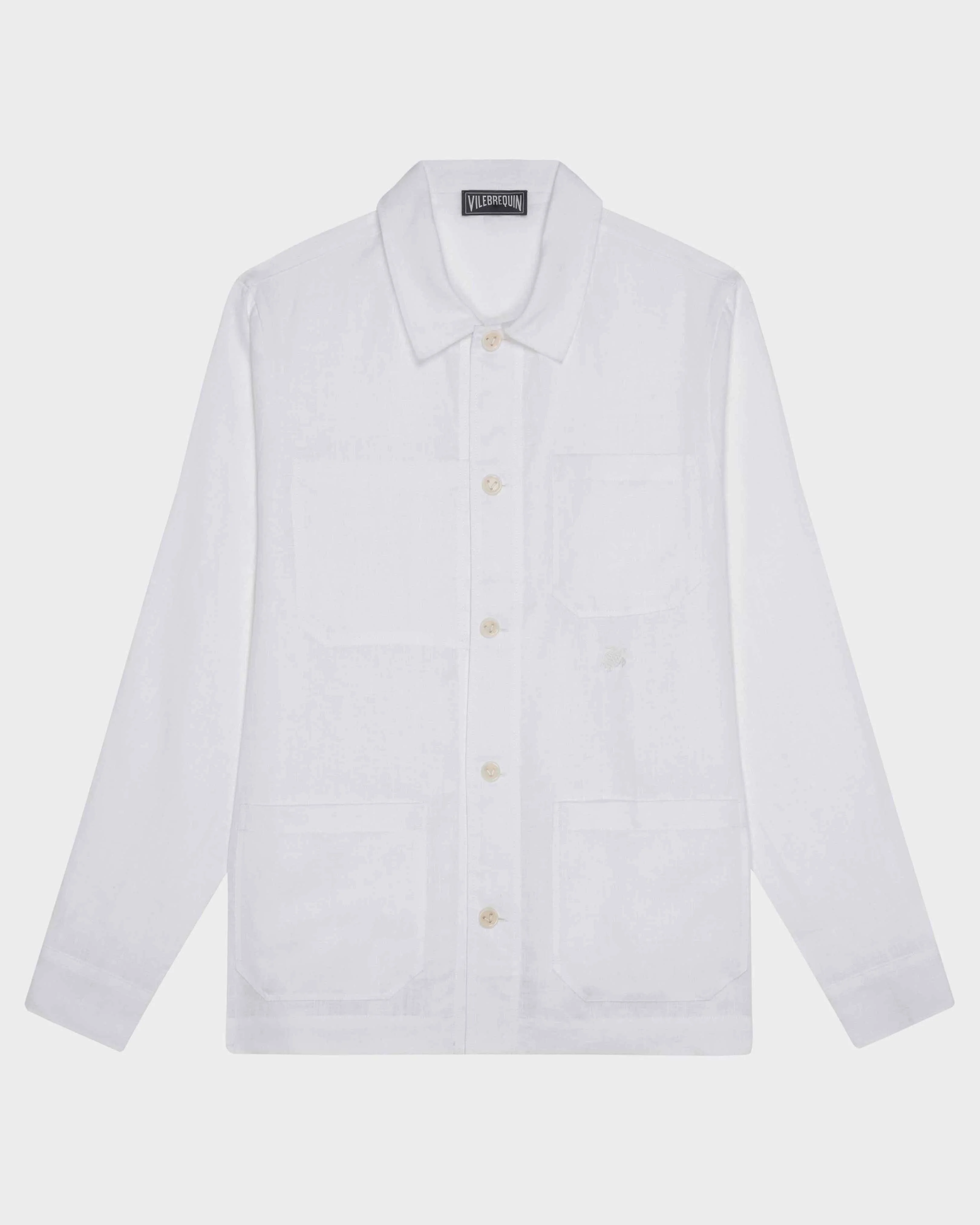 Layer with elegance in this refined linen overshirt, perfectly suited as a lightweight summer jacket. A subtle touch of distinction comes from the signature tone-on-tone embroidered turtle - Men Linen overshirt - Three front patch pockets, including one on the left chest - One inner chest pocket on the right - Tone-on-tone turtle embroidery - Simple button placket - Side slits - Men Linen Jacket - Men Linen Solid Overshirt - 100% linen Product Information Style: Corentin Model: CRTU3U01-010 Color: WHITE / WHITE