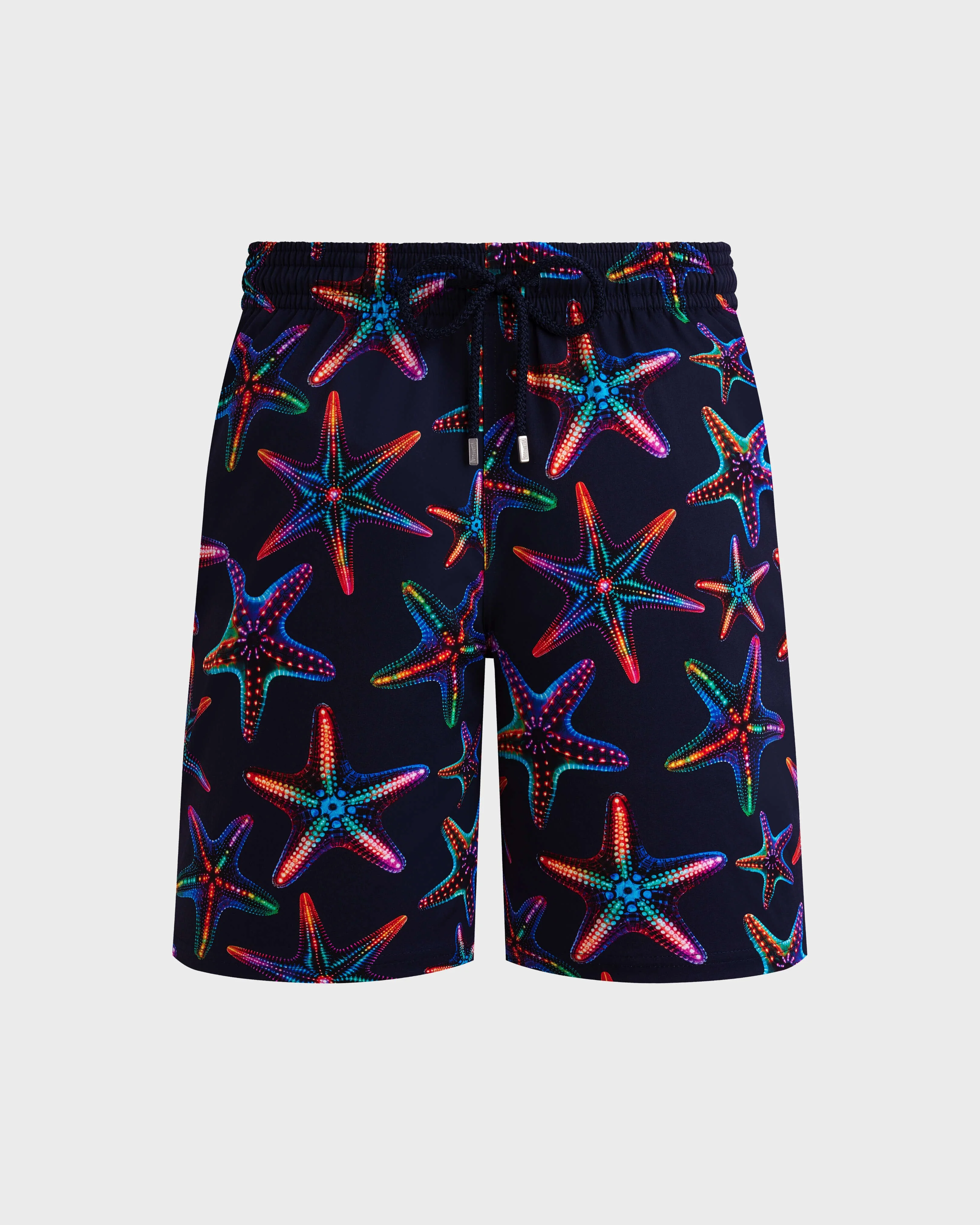 A vibrant pair of swim shorts in this season's eye-catching disco stars design. Featuring back and side pockets and a comfortable elasticated waistband and drawstring finished with Vilebrequin-engraved tips. - Long stretch swim trunks with elastic waistband with drawstring and zamac tips engraved Vilebrequin - Side pockets - Back pocket with Velcro flap - Two back eyelets - Side leg length in size M: 19" - Inseam for size M: 8" - The model is 6'1.62" and wears a M size - Long men swim shorts - Men stretch swim shorts Disco Stars - 98% recycled polyester 2% elastane Product Information Style: Okorise Model: OKICF107-390 Color: NAVY / BLUE