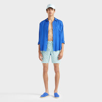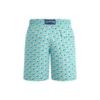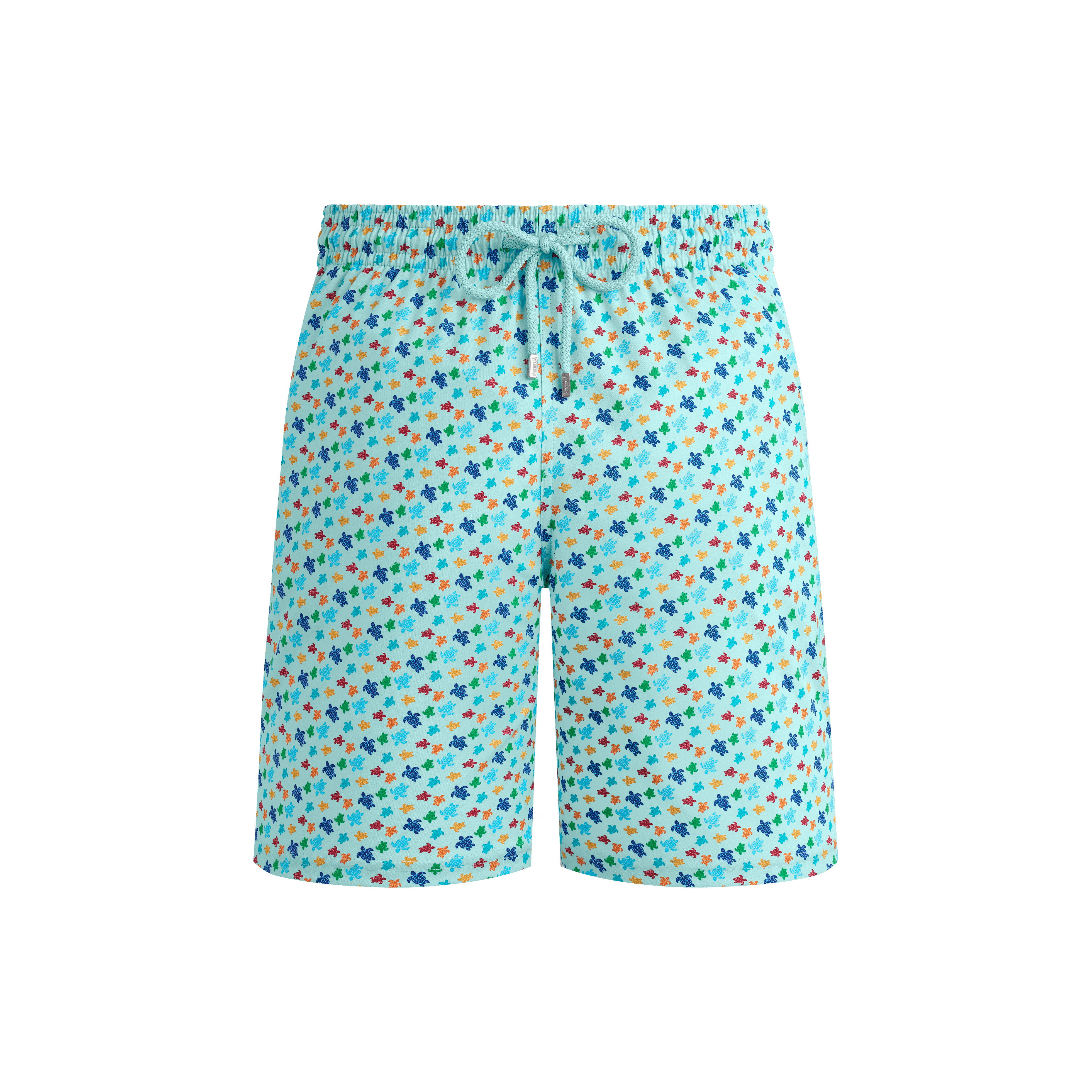 A brightly printed turtle-embellished pair of men's swim shorts styled in a longer length. Recycled polyester and elastane fabric and an elasticated waistband with a drawstring ensure a comfortable fit. - Men long stretch swim trunks with elastic waistband with drawstring and zamac tips engraved Vilebrequin - Side pockets - Back pocket with Velcro flap - Two back eyelets - Side leg length in size M: 19" - Inseam for size M: 8" - The model is 6'0.83" and wears a M size - Men Swim shorts - Men Swim shorts Micro Ronde Des Tortues Rainbow - 98% recycled polyester 2% elastane Product Information Style: Okorise Model: OKICF139-315 Color: PACIFIC / BLUE