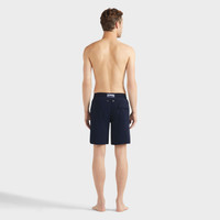 Streamlined and sophisticated, these Okoa men's long swimming trunks combine a relaxed long cut with the elegance of a timeless plain design. They are also made from an eco-friendly fabric using recycled fibres. High-quality men’s swim trunks - Elastic waistband with 4 lines of stitching for perfectly fitted swim trunks, drawstring adjustment - Men’s swim trunks with a peach finish for an extra soft feel and a twill weave for more suppleness - Ultra quick-drying men swim trunks thanks to a specific treatment - Okoa men’s swim trunks offering flawless fit and comfort thanks to the resistant and soft inner briefs with no centre seam (100% polyamide) - uni Men’s long swim trunks Men’s long swim trunks that guarantee flawless style - Length in size M: 19"/ Inseam: 8.5" - Eyelets at the back designed to easily drain water from the Okoa men’s swim trunks - Okoa men swim trunks with Vilebrequin engraved stainless zamak (zinc, aluminium and magnesium alloy) drawstring tips - Hand-placement of back pocket for perfect visual alignment with men swim trunks print Composition of the Okoa men’s long swim trunks: - 100% Recycled Polyamide Product Information Style: Okoa Model: OKOC4A00-990 Color: BLACK / BLACK