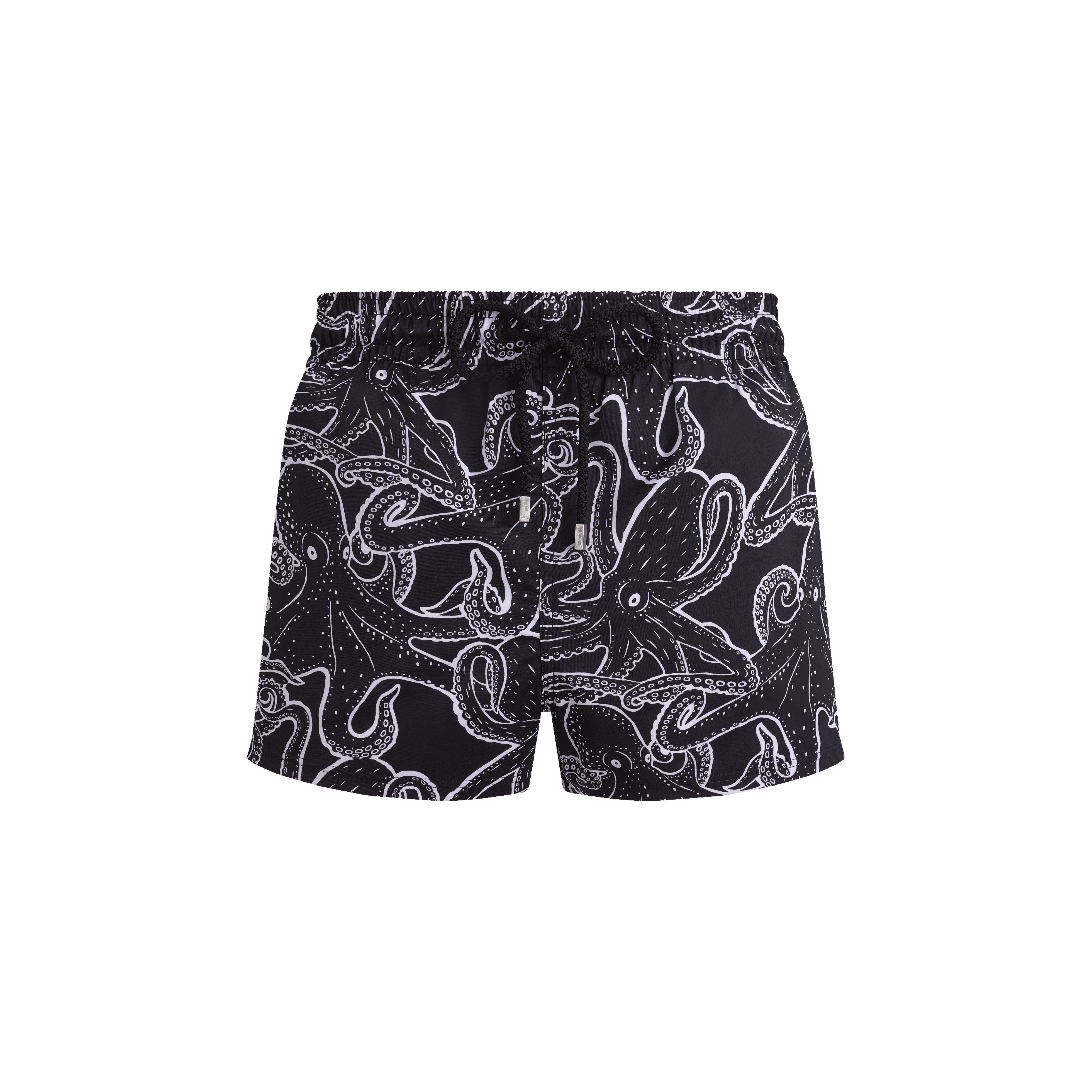 A distinctive pair of men's swim shorts adorned with the iconic Vilebrequin Poulpes octopus. Finished with zamac-engraved tips on the drawstring and featuring an elasticated waistband for comfort. - Short printed swim trunks for men - Elastic waistband - Drawstring, zamac tips engraved Vilebrequin - Side pockets - Side lenght in size M: 12" - Inseam in size M: 3,15" - The model is 6'1.62" and wears a M size - Men Swim shorts - Men Swim shorts Poulpes - 98% recycled polyester 2% elastane Product Information Style: Manta Model: MTACF504-990 Color: BLACK / BLACK