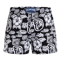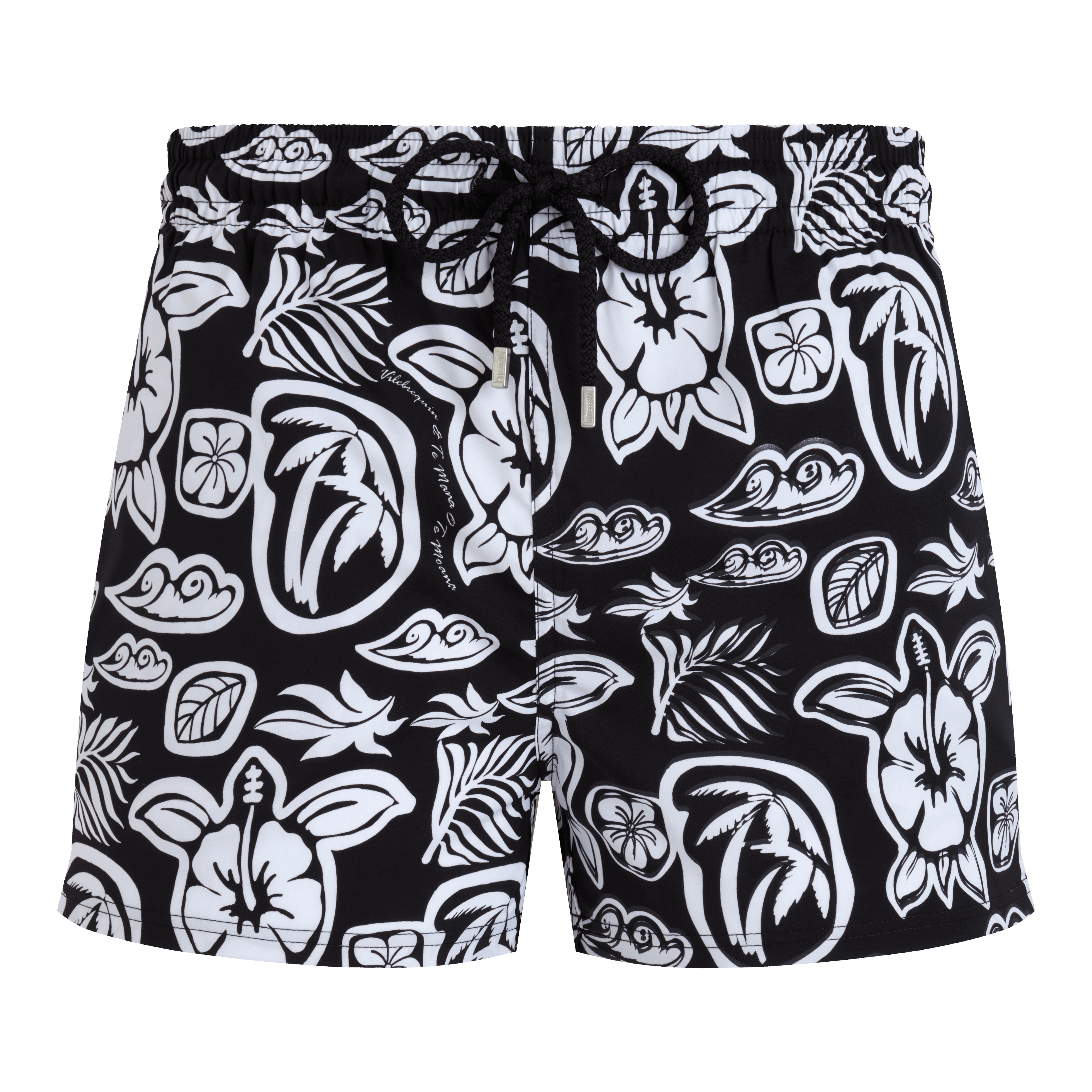 The perfect mens swim trunks for summer pool parties or beach days, these black and white swim trunks in recycled polyamide and elastance are inspired by the exotic island of Tahiti. - Mens Short printed swim shorts - Elastic waistband - Drawstring, zamak tips engraved Vilebrequin - Side pockets - Men Swim Trunks Tahiti Turtles - The model is 70.8" tall and wears a size M - Men Short Swim Trunks - 98% recycled polyamide 2% elastane Product Information Style: Manta Model: MTAAF501-990 Color: BLACK / BLACK