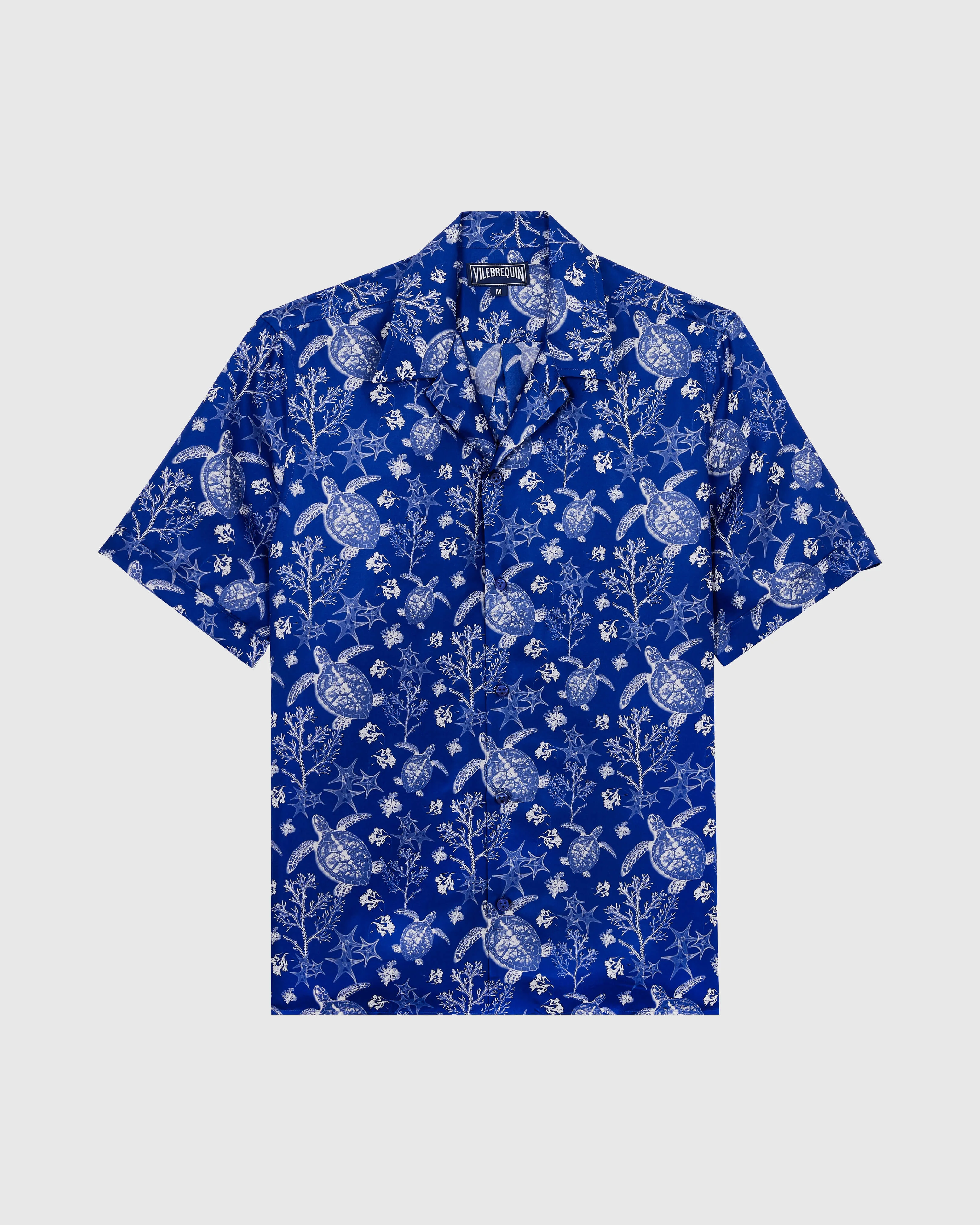 The unique print on this chic shirt captures the essence of summer. Made from breathable, lightweight silk, it provides both comfort and a subtle shine, adding a hint of elegance. An effortlessly stylish and comfortable option for hot days. - Bowling shirt - Short sleeves with turned back cuffs - Chest pocket - Two slits on each side - Embroidered turtle tone on tone on the bottom left - Button fastening - Middle back length for a size M: 74.00cm - Men Shirt - Men Shirt X-Ray Turtles - 100% silk Product Information Style: Charli Model: HARCW227-613 Color: MARRAKECH / BLUE