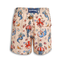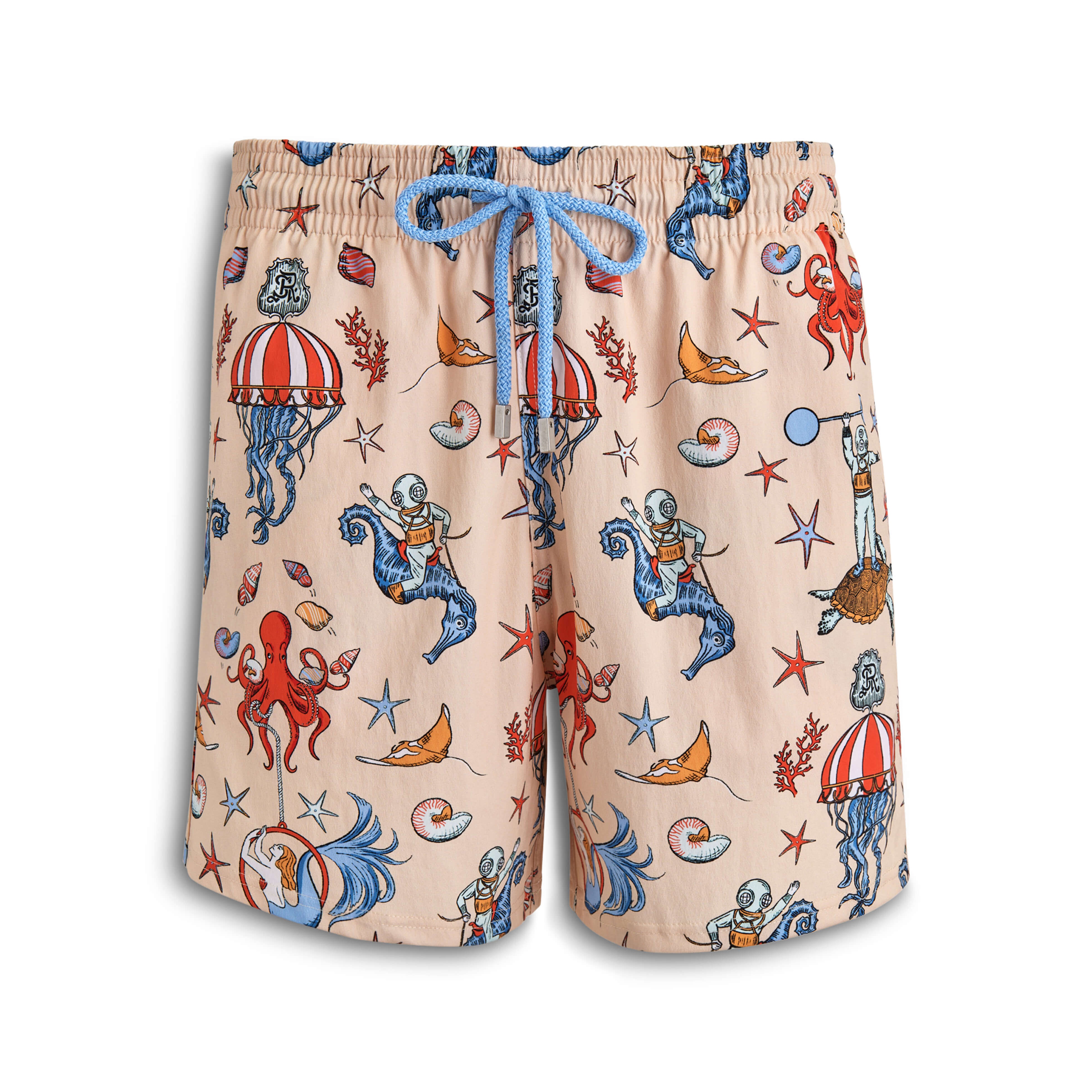 Vilebrequin, renowned for its exceptional craftsmanship and dedication to elevating the art of beach living, is set to open a new boutique within the prestigious St. Regis Resort in Longboat Key. To mark the occasion, an exclusive capsule collection of swimwear and beach accessories was imagined, featuring a marine-inspired print that playfully nods to Sarasota’s historic connection to the Ringling Bros. circus. - Shorter length swim trunks for men with stretch fabric - Elastic waistband with drawstring and zamac tips engraved Vilebrequin - Two side pockets and one rear couture pocket with velcro flap - Two back eyelets - Side leg length in size M: 14.5" - slightly shorter than the classic Moorea - Inseam leg length in size M: 5.7" - Men Swim shorts - Men Stretch Short Swim Shorts Aqua Circus - 98% recycled polyester 2% elastane