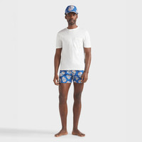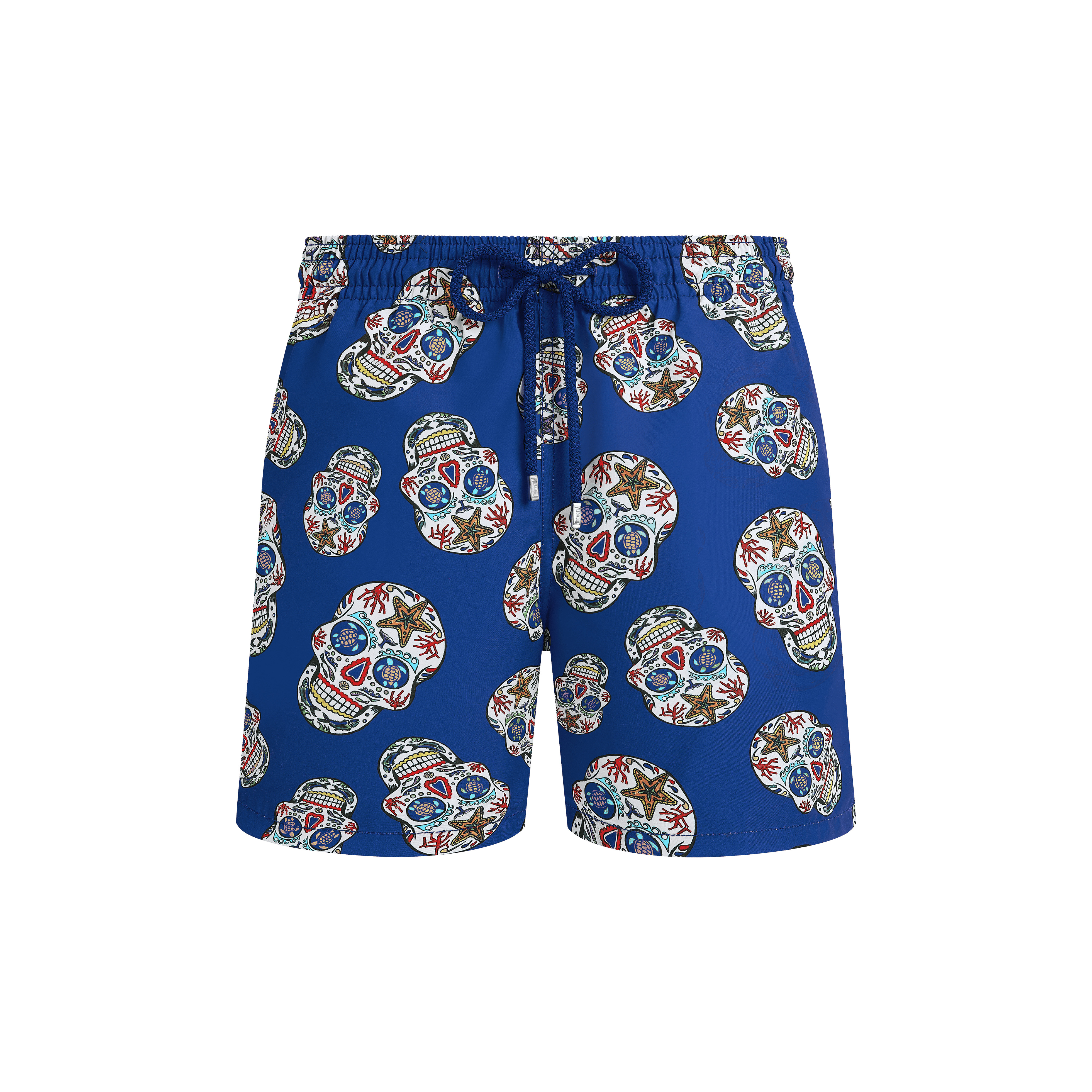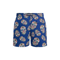 The premium stretch fabric crafted from recycled polyamide makes the swimming suits in this collection ensure both comfort and durability. The vibrant colors and bold patterns reflect the joy and beauty of Dia de Muertos, making each piece a statement of cultural pride and fashion-forward elegance. Whether at the beach or by the pool, wearers will feel a connection to the deeper meanings and festive spirit of the holiday - Men shorter length swim shorts with stretch fabric - Elastic waistband with drawstring and zamac tips engraved Vilebrequin - Two side pockets and one rear couture pocket with velcro flap - Two back eyelets allow water to drain and reduce the "balloon” effect when emerging from the water - Side leg length in size M: 14.5 - slightly shorter than a Moorea classic style - The model is 189cm tall and wears a size M - Men Swim Shorts - Men Swim Shorts Dia de Muertos - 98% Recycled Polyamide - 2% Elastane Product Information Style: Moorise Model: MSOZB605-602 Color: PALACE / BLUE