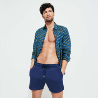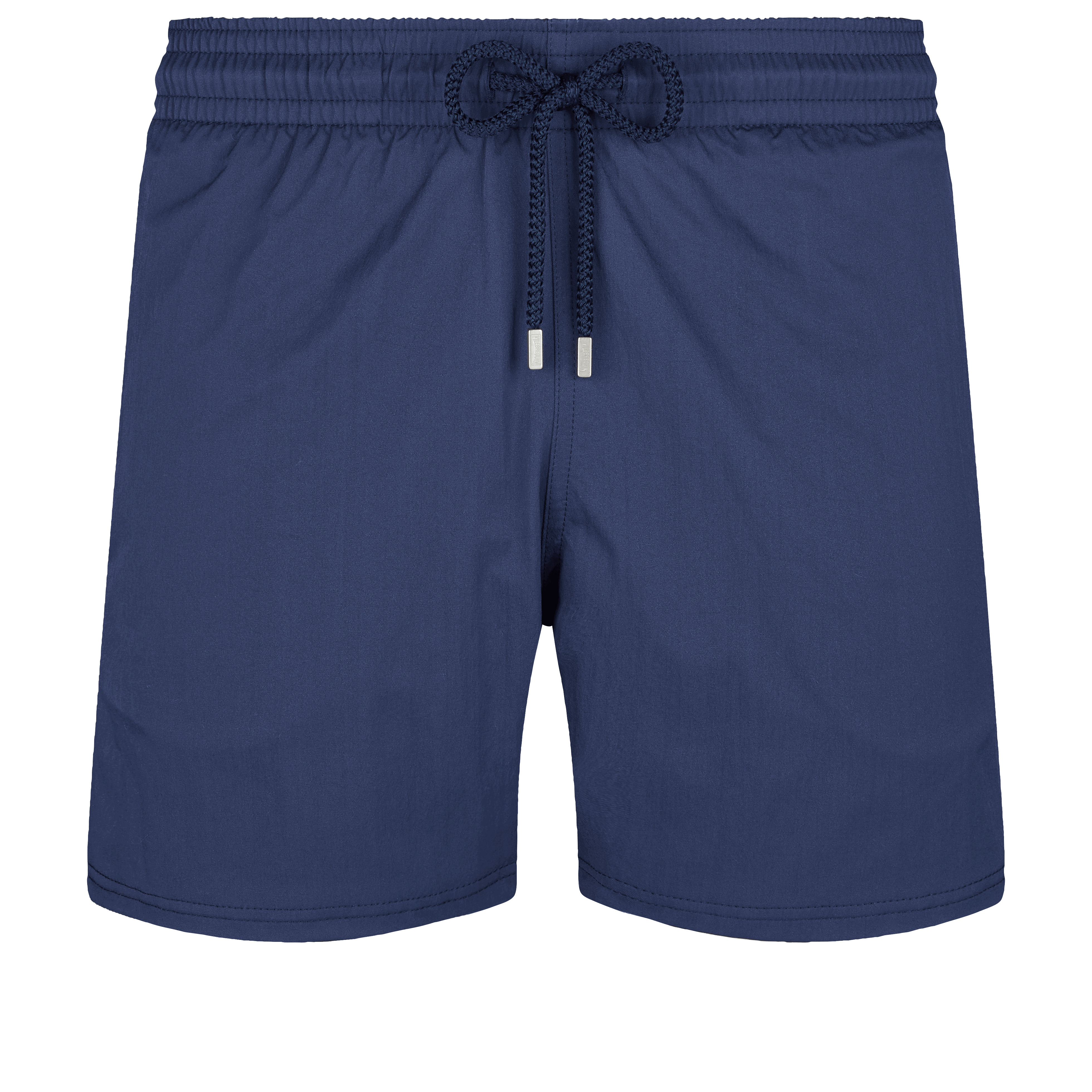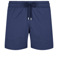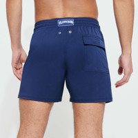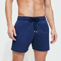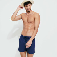 Brush up on your classics with these Moorise men's short stretch swimming shorts. The stretchy fabric and timeless cut make these three-pocket men swim shorts a timeless basic. They have a drawstring on an elasticated waistband. Brush up on your classics with these Moorise men's short stretch swimming trunks. The stretchy fabric and timeless cut make these three-pocket men swim trunks a timeless basic. They have a drawstring on an elasticated waistband. High-quality men’s stretch swim trunks - Fully elastic waistband with four lines of stitching for optimal comfort, and drawstring - Men swim trunks in stretch material for more comfort - Specially treated material for extra quick-drying men swim trunks - Flawless fit and comfort thanks to the resistant and soft inner briefs with no centre seam (100% polyester) - Solid stretch men’s swim trunks Chic and laid-back men’s swim trunks - Leg length for size M : 14.5" / Inseam 4.25". A shorter version of the classic Moorea men’s swim trunks - Men's swim trunks with eyelets at the back designed to drain water (no ballooning) - Vilebrequin engraved stainless Zamak (zinc, aluminium and magnesium alloy) drawstring tips - Hand-stitching of back pocket for perfect print alignment Composition of the Moorise men’s stretch swim trunks: - 98% Polyamide - 2% Elastane Product Information Style: Moorise Model: MSOE9E01-390 Color: NAVY / BLUE