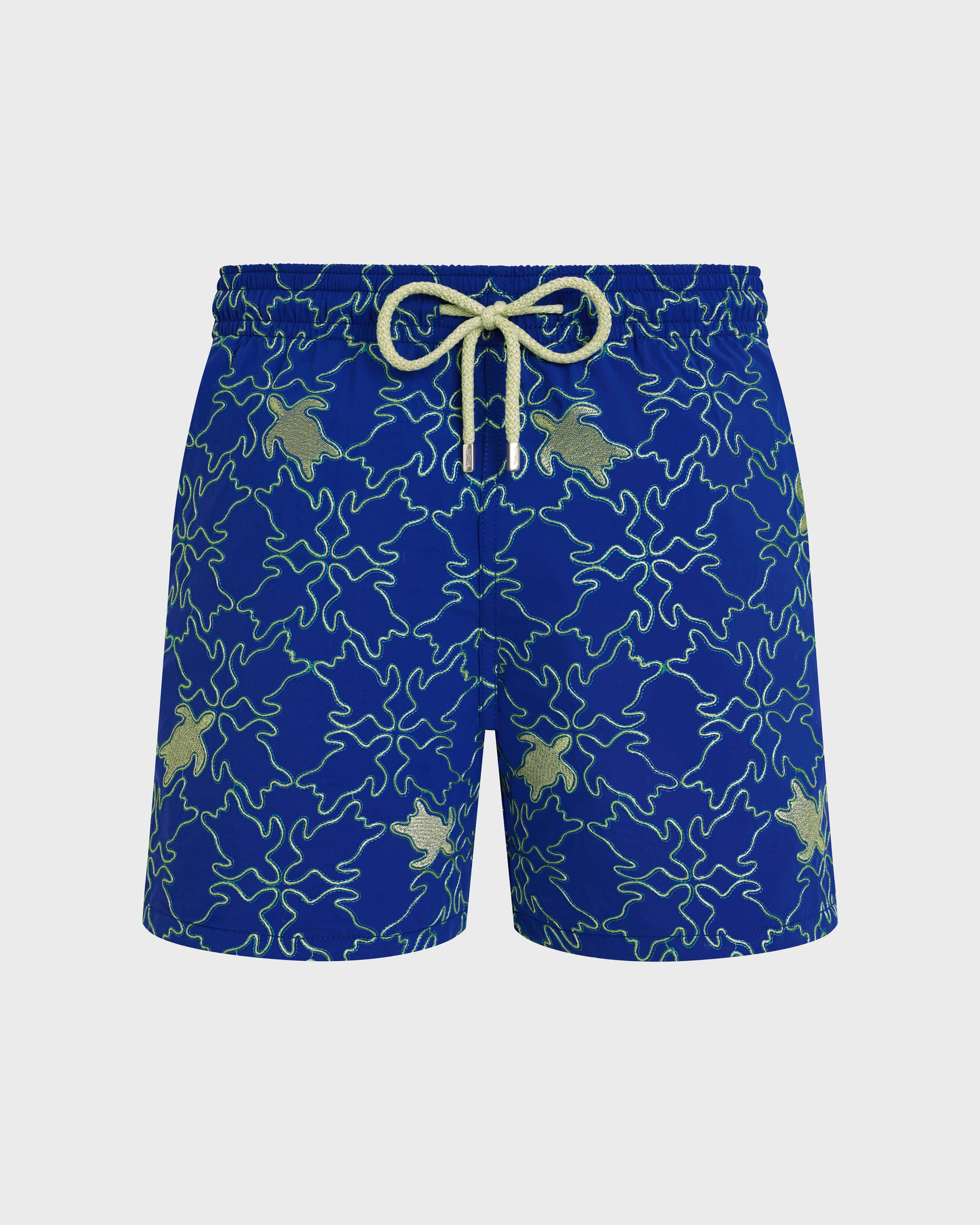Product Detail 100% recycled polyamide Welcome summer in these Turtles Net-print swim shorts crafted from recycled polyamide. The iconic Vilebrequin logo enhances the back, while an elasticated waistband and drawstring with metal-engraved tips complete the detail. - Embroidered swimsuit, limited edition, 99 pieces for the colors Poppy Red and Lime Green, 199 pieces for the color Marrakech Blue. - Swim trunks with elastic waistband with drawstring and silver tips (engraving 925 certified) - Side pockets and back pocket with Turtle personnalized round snap button. Two back eyelets - Enjoy a complimentary first repair of your swim trunks, if registered within 6 months - Fully lined with water-resistant mesh lining (100% polyamide) - Side leg length in size M: 15.6" - Inseam length in size M: 5,9" - The model is 6'1 and wears a M size - Men Swim Shorts - Men Swim Shorts Turtles Net Care To take care of your Swim Shorts we advise you to follow our suggestions below: - Wash at 30'C - Dry line in the shade - Do not bleach - Do not tumble dry - Iron at low temperature