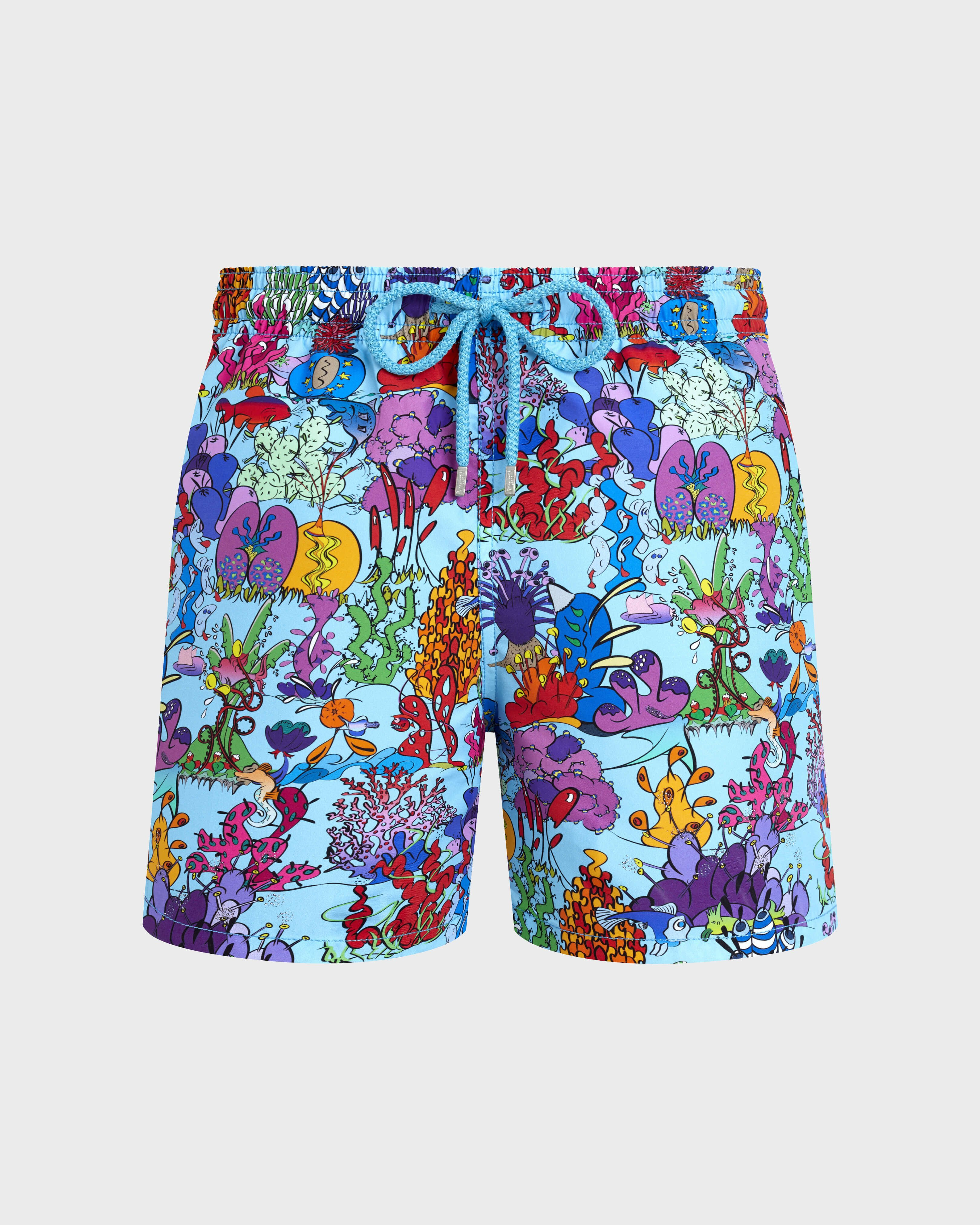 Product Detail 100% recycled polyamide The all-over Aquatic Plant print on these swim shorts conjures up vibrant vibes. The adjustable drawstring completes the style with its Vilebrequin-engraved tips. - Elastic waistband swim trunks with drawstring and Zamac tips engraved Vilebrequin - Side pockets - Hand-placement of back pocket for perfect visual alignment with swimwear print - Two back eyelets allow water to drain and avoid swim trunks from ballooning when emerging into water - Fully lined with water-resistant mesh lining (100% polyamide) - Side leg length in size M: 15.6" - Inseam length in size M: 5,9" - The model is 6' and wears a M size - Men Swim Shorts - Men Swim Shorts Plantes Aquatiques Care To take care of your Swim Shorts we advise you to follow our suggestions below: - Wash at 30'C - Dry line in the shade - Do not bleach - Do not tumble dry - Iron at low temperature