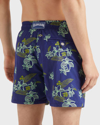 These embroidered tropical flower swim shorts feature an elasticated waist and drawstring for comfort. Side and a back pocket enhanced with a turtle-embossed snap button add a stylish finish. - Embroidered men swim trunks, limited numbered edition, 99 pieces for the color moka, 99 pieces for the color midnight, 99 pieces for the color peacock - Swim trunks with elastic waistband with drawstring and silver tips (engraving 925 certified) - Side pockets and back pocket with Turtle personnalized round snap button. Two back eyelets - Enjoy a complimentary first repair of your swim trunks, if registered within 6 months - Fully lined with water-resistant mesh lining (100% polyamide) - Side leg length in size M: 15.6" - Inseam length in size M: 5,9" - The model is 6'0.83" and wears a M size - Men Swim trunks - Men Swim trunks shorts Embroidered Flowers Power - 100% recycled polyamide Product Information Style: Mistral Model: MISCC618-605 Color: MIDNIGHT / BLUE