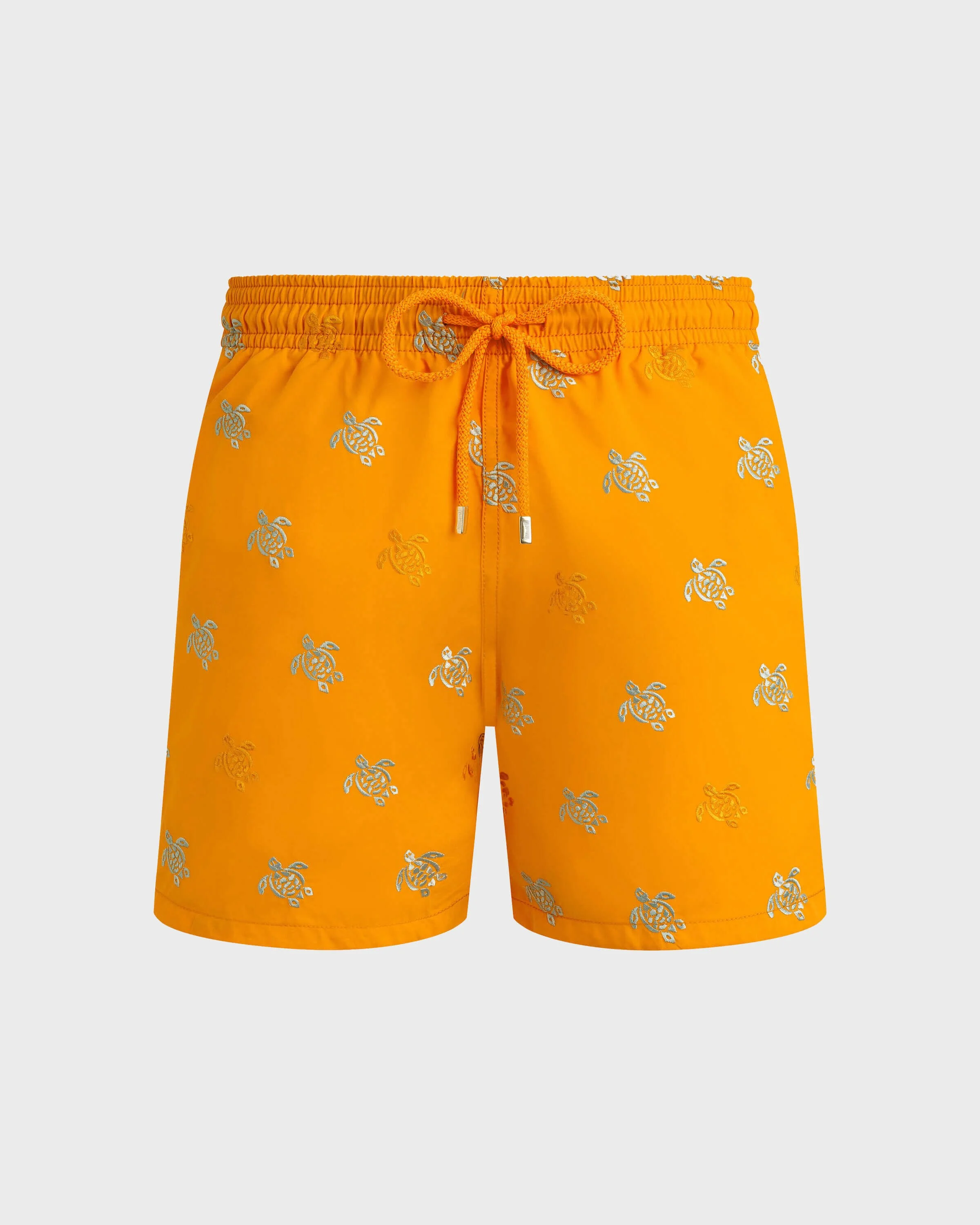 These brightly coloured men swim trunks adorned with turtles capture the exotic holiday theme. Cut from recycled polyamide with an elasticated waist and drawstring for added comfort. - Embroidered men swim trunks limited edition, 99 pieces for the color white, 99 pieces for the color Poppy Red, 99 pieces for the color Oleander Pink - Swim trunks with elastic waistband with drawstring and silver tips (engraving 925 certified) - Side pockets and back pocket with Turtle personnalized round snap button - Two back eyelets - Fully lined with water-resistant mesh lining (100% polyamide) - Enjoy a complimentary first repair of your swim trunks, if registered within 6 months - Side leg length in size M: 15.6" - The model is 74.4" tall and wears a size L - Men Swim Trunks Micro Ronde des Tortues Diagonale - Men Swim Trunks - 100% recycled polyamide Product Information Style: Mistral Model: MISBC493-172 Color: CARROT / ORANGE