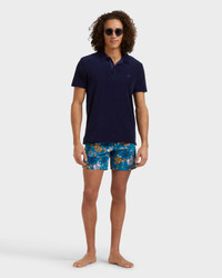 Product Detail Limited edition Mistral Tropical Turtles men's embroidered swimming trunks. A veritable underwater forest picked out by delicate embroidery. - Embroidered men swim shorts, limited production, 99 pieces for the color brick red, 99 pieces for the color yellow, 199 pieces for the color Neon blue, 99 pieces for the color orange, 199 pieces for the color Navy blue. - Men swim trunks with elastic waistband with drawstring and silver tips (engraving 925 certified) - Enjoy a complimentary first repair of your swim shorts, if registered within 6 months. - Men swim trunks with side pockets and back pocket with Turtle personnalized round snap button - Two back eyelets - Fully lined with water-resistant mesh lining (100% polyamide) - Side leg length in size M: 15.6" - Tropical Turtles Men Swim Trunks - Men Swim Trunks - 1% Recycled Polyamide Care To take care of your adored men swim trunks, we advise you to follow our suggestions below: - Rinse your men swim trunks with fresh water after each use. - Wash your men swim trunks at 86F on a delicate program with like colors. - Do not use oxygenated or chlorine based bleach/ stain removers. - Air-dry your men swim trunks and do not use tumble dryer. - It is not necessary to iron it, but if you do, limit the temperature to 23F and iron it on the inside out. - Never dry clean your men swim trunks. Don't forget that they love water!