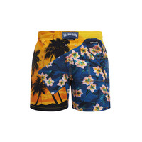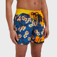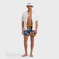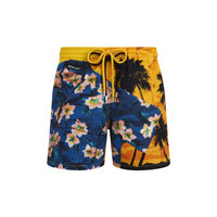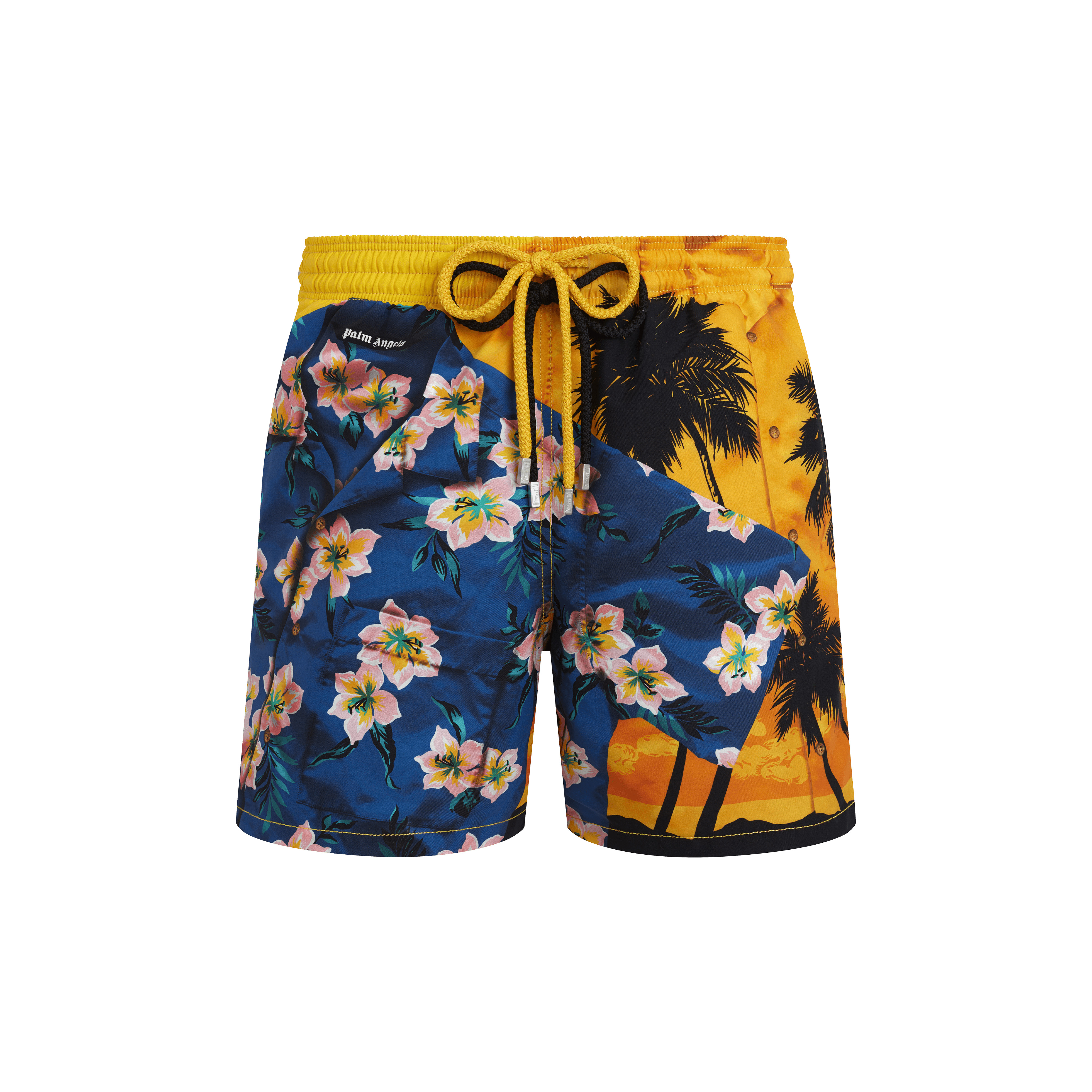 Merging streetwear and holiday art, this swimwear collection boldly reinterprets the iconic tropical print. The Hawaiian theme plays with trompe-l’œil techniques and presents two swimsuits with surprising patchwork effects. The presence of the double drawstring stylishly reinforces their streetwear spirit. Signature branding is artfully woven throughout, transforming the logo into a true design statement. - Men Elastic waistband swim trunks with drawstring and zamac tips engraved Vilebrequin - Side pockets - Hand-placement of back pocket for perfect visual alignment with swimwear print - Two back eyelets allow water to drain and avoid swim trunks from ballooning when emerging into water - Fully lined with water-resistant mesh lining (100% polyamide) - Side leg length in size M: 15.6" - Inseam length in size M: 5,9" - The model is 6'2.41" and wears a M size - Men Swim trunks - Men Swim trunks Hawain Mix - VBQ x Palm Angels - 100% recycled polyamide Product Information Style: Moorea Model: MOOZB107-115 Color: CORN / YELLOW