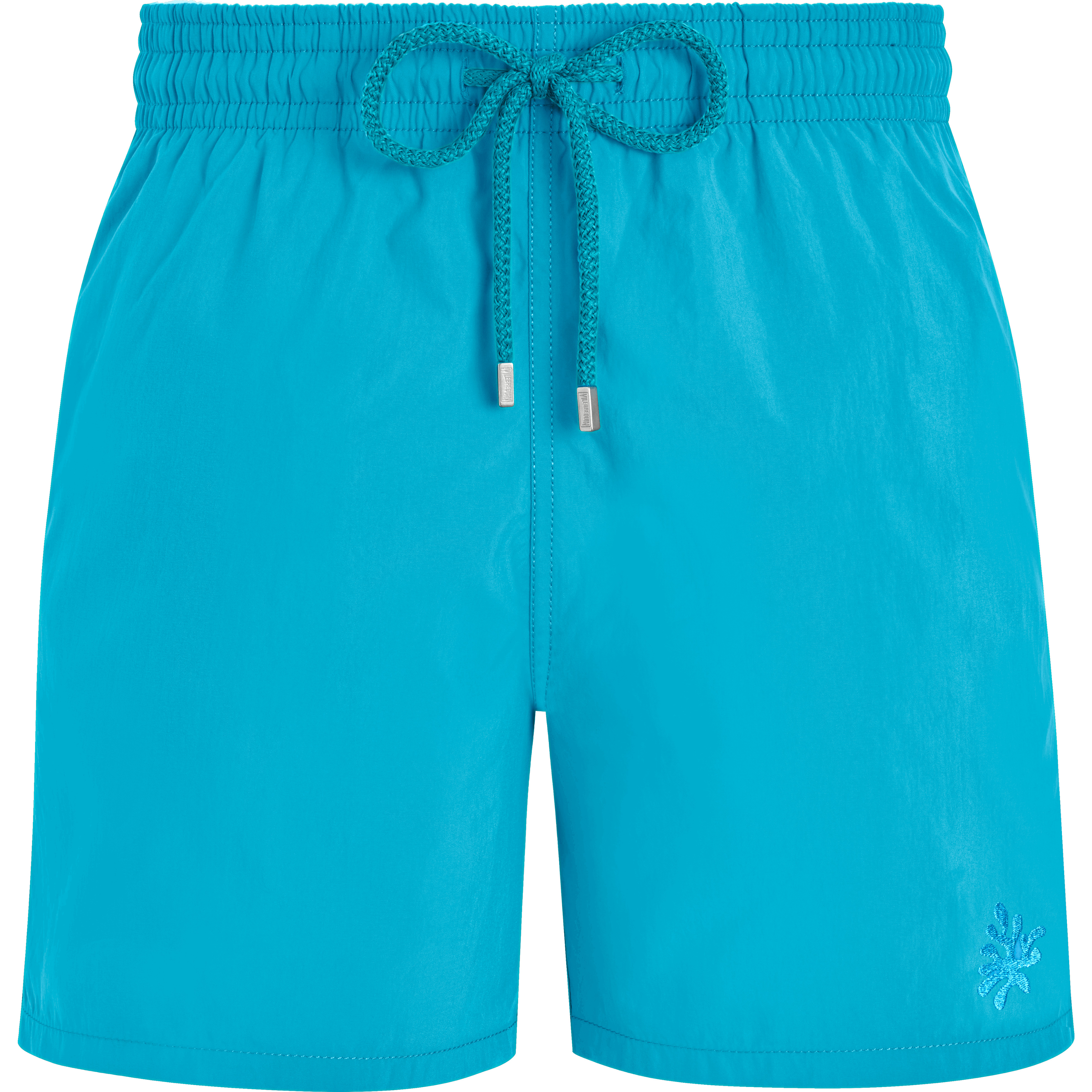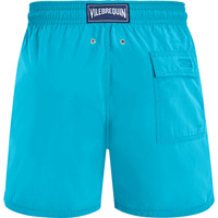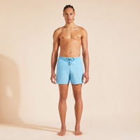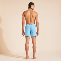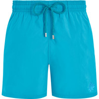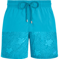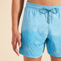 Make a splash in this pair of lined recycled polyamide men swim trunks with an elastic waistband and drawstring for the ultimate tailored fit. Once wet, the plain surface of these water-reactive men's swim trunks will reveal an array of turtles in tone-on-tone - Elastic waistband swim trunks with drawstring and zamac tips engraved Vilebrequin - Side pockets - Hand-placement of back pocket for perfect visual alignment with swimwear print - Two back eyelets allow water to drain and avoid swim trunks from ballooning when emerging into water - Fully lined with water-resistant mesh lining (100% Polyamide) - Side leg length in size M: 15.6" - Men Swim Trunks - Men Swim Trunks water-reactive Splash - 100% Recycled Polyamide Product Information Style: Moorea Model: MOOAD125-600 Color: SANTORINI / BLUE