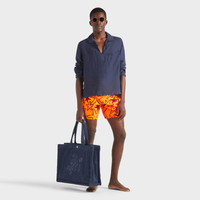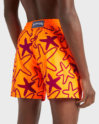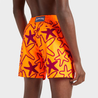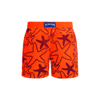 Make an entrance on the beach in these vibrant, lightweight, flocked shorts crafted from recycled polyester and featuring Vilebrequin-engraved drawstring tips. It packs into the back pocket for easy traveling. - Ultra-light material - Elastic waistband with drawstring and Zamac tips engraved Vilebrequin - Two side pockets - Two back eyelets - Travel-friendly swimsuit folds completely into the back pocket - Side leg length in M: 39.5 cm - Men Swim shorts - Men Swim shorts Flocked Starlettes - 100% recycled polyester Product Information Style: Mahina Model: MAHCD302-136 Color: FLUO FIRE / ORANGE