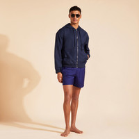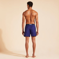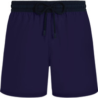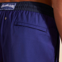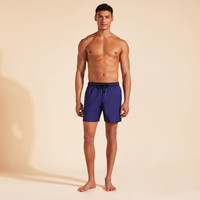 These chic wool swim trunks team perfectly with a shirt for a laid-back lunch. Featuring a contrasting elastic and drawstring waistband for exceptional tailored comfort. Wool's natural properties such as breathability, UV resistance, and softness make the natural fiber ideal for swimwear. - Elastic waistband swimwear with drawstring and zamac tips engraved Vilebrequin - Waistband in fabric and colors opposition, tone on tone drawstring with the waistband - 2 side pockets, 1 back pocket with Velcro flap - Two back eyelets allow water to drain and avoid swim trunks from ballooning when emerging into water - Fully lined with water-resistant mesh lining (100% Polyamide) - Side leg length in M: 39.5 cm - Fabrics are treated for fast-dry - Men Swim Trunks - Men Swim Trunks Wool Super 120 - 100% Wool Product Information Style: Magnus Model: MGUAL251-605 Color: MIDNIGHT / BLUE