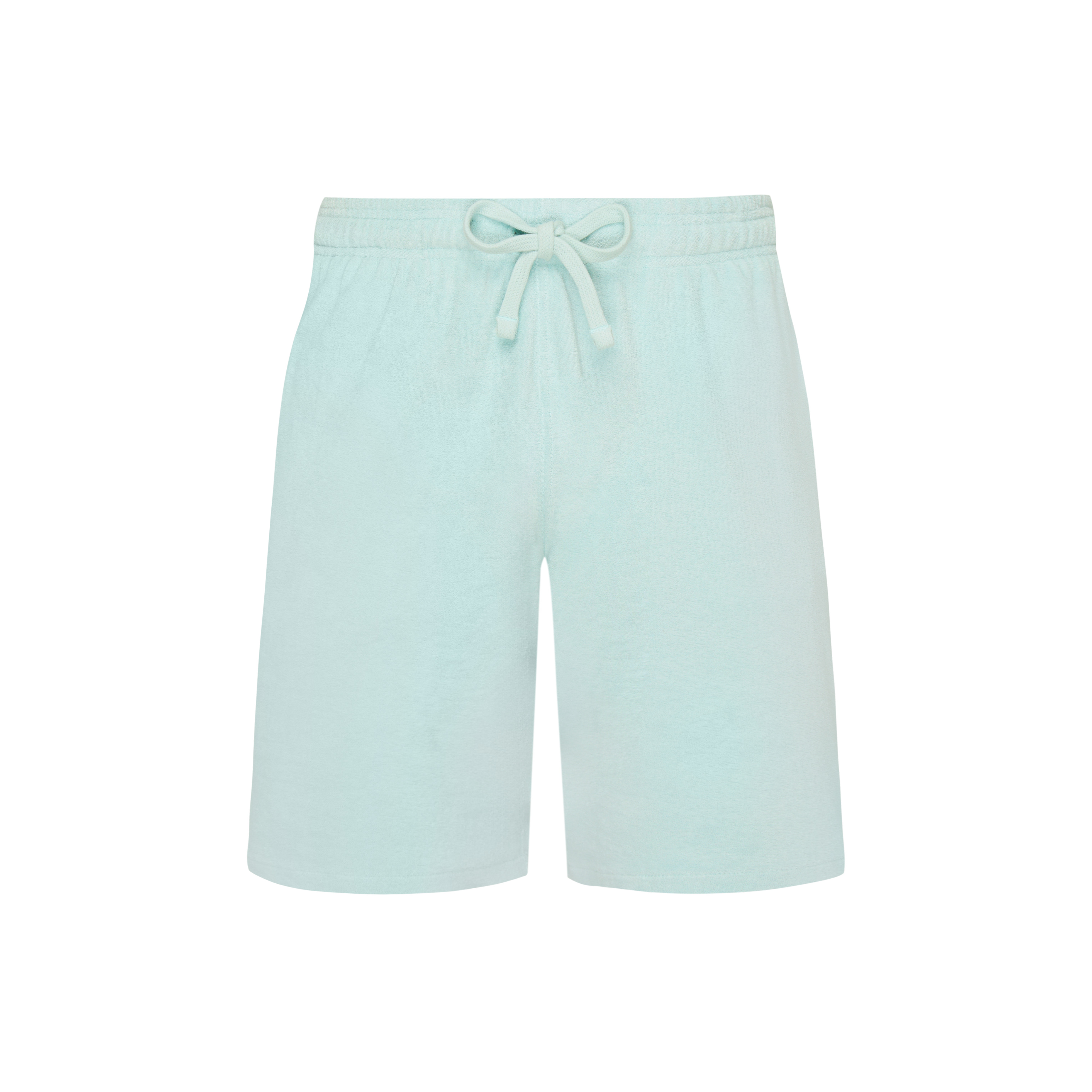 Comfort is genderless with these Vilebrequin terry bermuda shorts. This comfortable basic is as essential for lazing around at home as it is for a stroll at the beach. The bermuda shorts have an elasticated waistband with a drawstring, as well as a Vilebrequin logo and a patch pocket with a flap on the back. - Bermuda short in lightly terry - Two italian side pockets - Back flap pocket with velcro closure and center back - Elastic waistband, tone on tone drawstring with custom Vilebrequin zamac metal tips - Bottom leg widtth for a size M: 10.63" - Side length for a size M: 19.29" - Front crotch Length for a size M: 12.00" - Solid Men Bermuda - Men Bermuda - Model wears size M - Model measurements: Height 75.2”, Bust 39.4”, Waist 32.3”, Hips 39.8” - 86% Organic Cotton - 14% Polyamide Product Information Style: Bolide Model: BOLC3Q02-315 Color: PACIFIC / BLUE