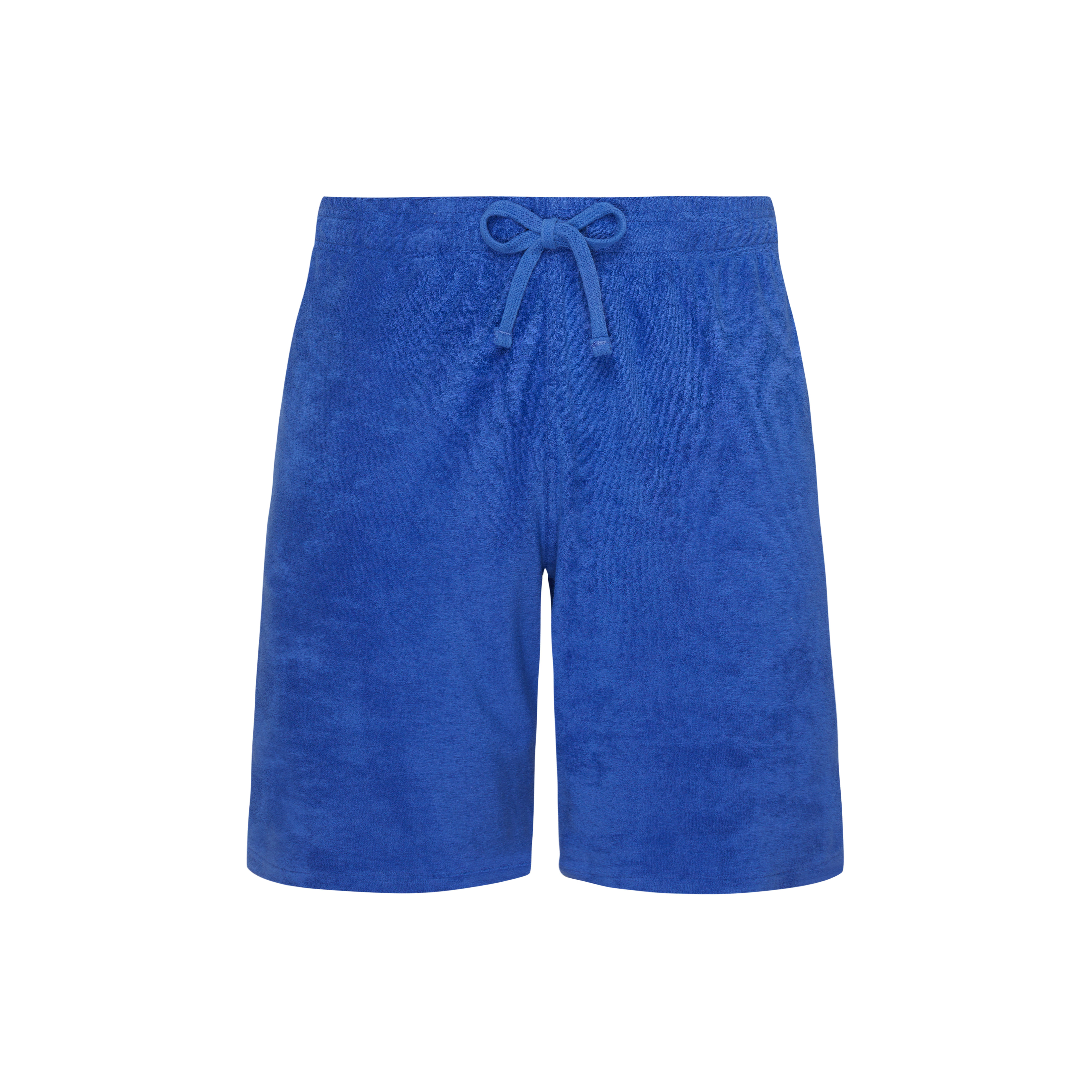 Comfort is genderless with these Vilebrequin terry bermuda shorts. This comfortable basic is as essential for lazing around at home as it is for a stroll at the beach. The bermuda shorts have an elasticated waistband with a drawstring, as well as a Vilebrequin logo and a patch pocket with a flap on the back. - Bermuda short in lightly terry - Two italian side pockets - Back flap pocket with velcro closure and center back - Elastic waistband, tone on tone drawstring with custom Vilebrequin zamac metal tips - Bottom leg widtth for a size M: 10.63" - Side length for a size M: 19.29" - Front crotch Length for a size M: 12.00" - Solid Men Bermuda - Men Bermuda - Model wears size M - Model measurements: Height 75.2”, Bust 39.4”, Waist 32.3”, Hips 39.8” - 86% Organic Cotton - 14% Polyamide Product Information Style: Bolide Model: BOLC3Q02-613 Color: MARRAKECH / BLUE