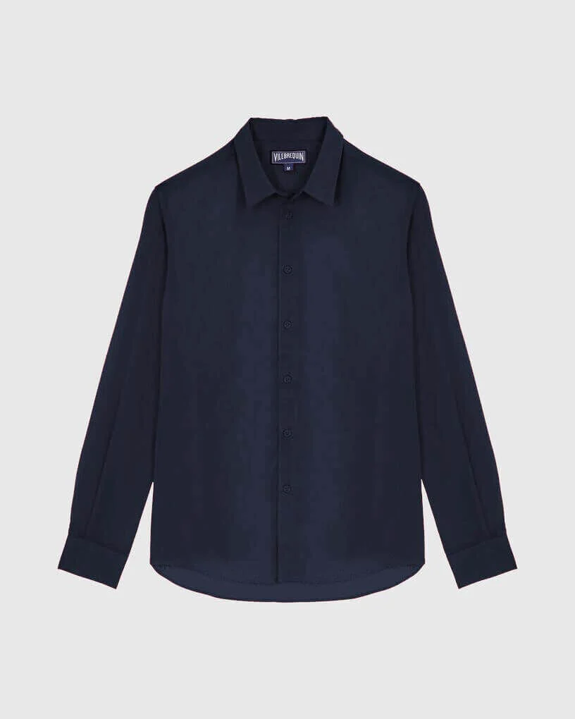 Learn the art of minimalism with the Caracal organic cotton voile shirt. Lightweight and minimalist, it can be worn for every occasion, from sunny adventures to sophisticated evenings out. A shirt for men or women that is elegant in every circumstance - Caracal long-sleeved, fitted, straight-cut shirt - French-collar shirt for men or women - Shirt for men and women featuring a chest patch pocket - Tone-on-tone embroidery of the iconic Vilebrequin turtle on the bottom of this Caracal shirt - Solid organic cotton veil shirt A timeless shirt for men and women - Very pleasant-to-wear, lightweight cotton-voile shirt - Caracal design A quality shirt made to last - All the components of this Caracal cotton shirt, from the thread to the buttons, are designed to withstand wear and tear. - Model wears size M - Model measurements: Bust 38.6”, Height 74.4”, Waist 29.9”, Hips 37.4” Composition of the Caracal shirt: - 100% Organic Cotton Product Information Style: Caracal Model: CCAC3V00-390 Color: NAVY / BLUE