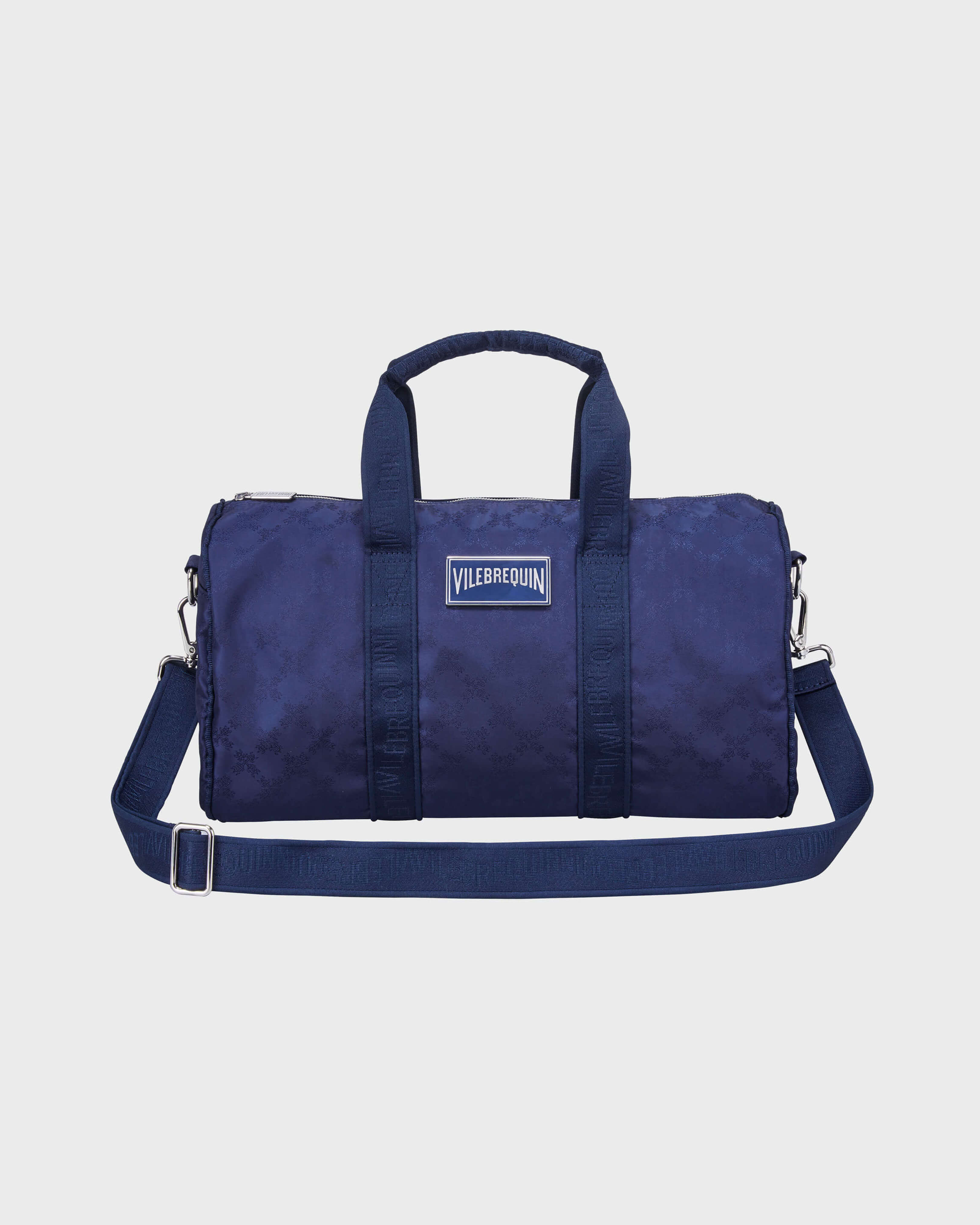 The perfect short-stay luxury travel bag crafted from recycled polyamide, recycled polyester, polyurethane and acrylic. The removable strap makes carrying your beach gear easy. - 48-hour travel bag - Vilebrequin monogram turtle print with jacquard effect - Metal zip closure with Vilebrequin-branded zip pull - Internal pocket with a monogram print - Vilebrequin-branded removable and adjustable strap - Dimension: length = 17.3" / width = 7.8" / height = 9.05" - Unisex Bag - Unisex Bag Turtle Dance Jacquard - 53% Recycled Polyamide - 32% Recycled Polyester - 11% Polyurethane - 4% Acrylic