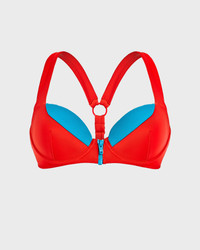 Freely inspired from a diving suit, this pop and sensual bikini top is made of our sculpting Solid Water fabric. It closes on the front thanks to a color contrasted zipper. - Top swimwear bicolor - 1 contrasted blue front closer zipper - bra wire - Solid Water fabric : Recycled fabric which shapped the body - 74% Polyamide recycled 26% Elastane