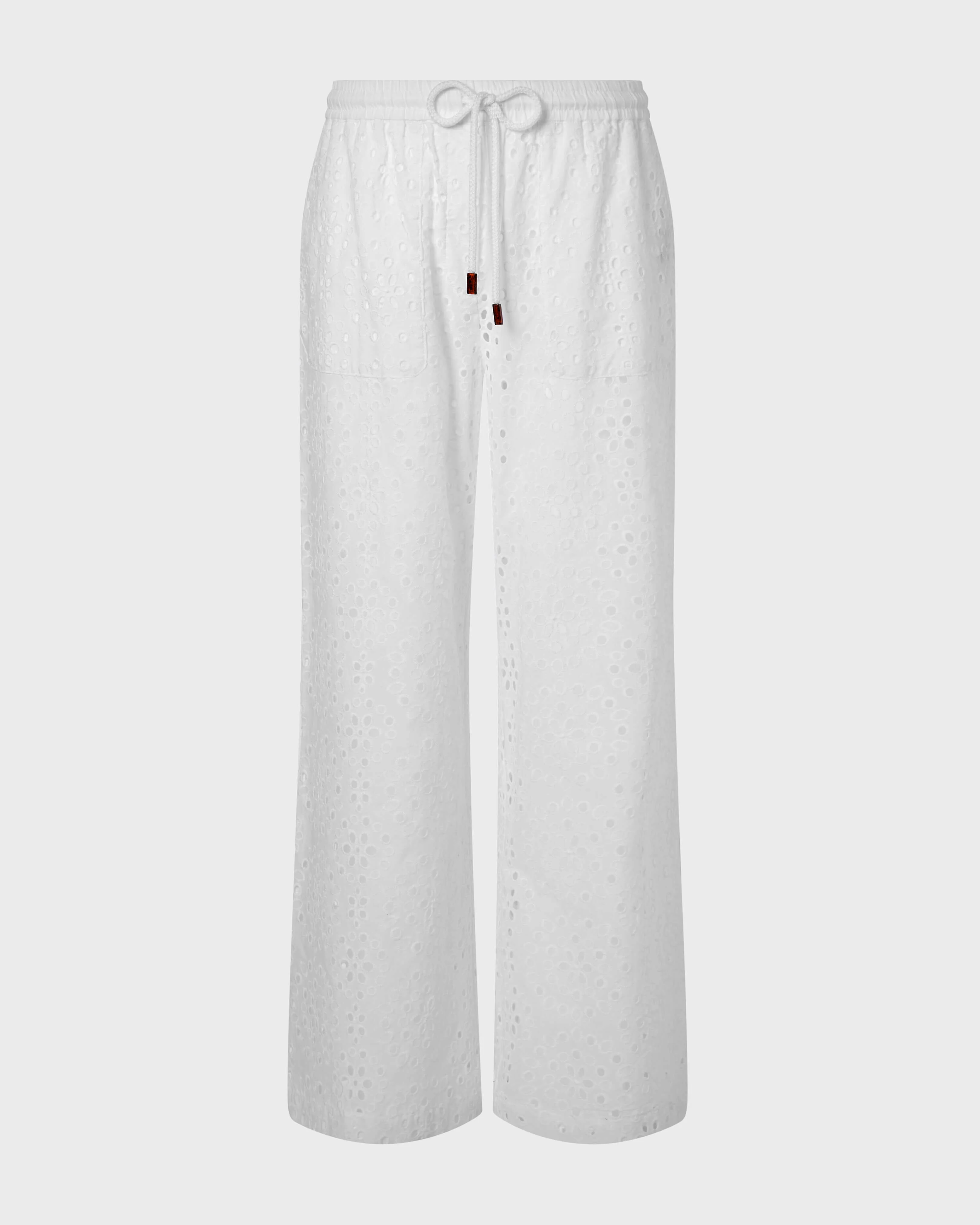Product Detail - Style : Freyja - Model : FYJ4A017-010 - Colour : WHITE / WHITE 100% cotton - Women’s fluid pants in floral broderie anglaise - Elastic waistband with drawstring featuring Vilebrequin personalized tortoise shell effect tips - Loose fit and side pockets Care To take care of your Trousers we advise you to follow our suggestions below: - Machine wash cold, gentle cycle - Wash with similar colours - Non-chlorine bleach only, if needed - Line dry in the shade - Iron at low temperature - Dry clean - Do not tumble dry