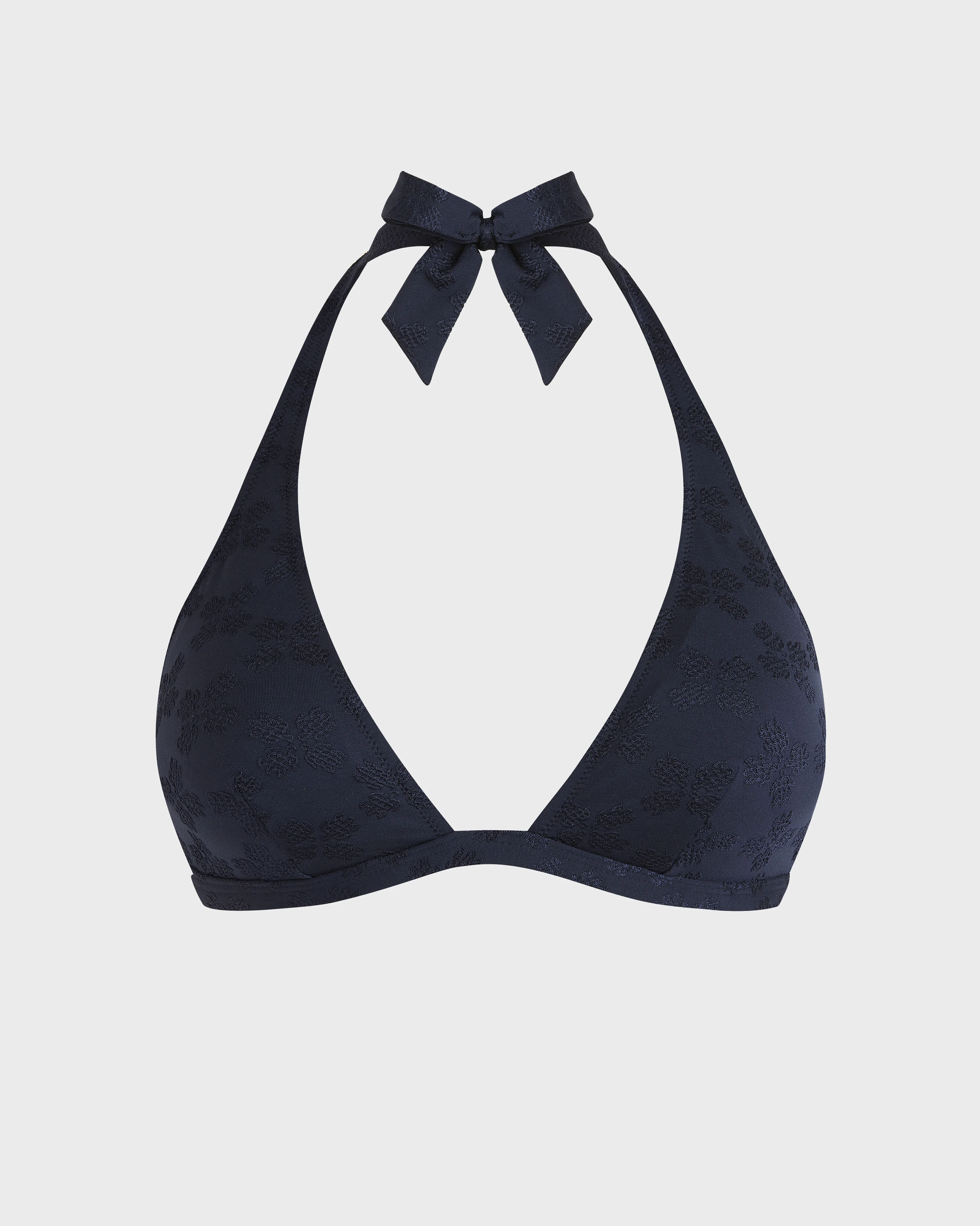 This elegant halter-neck bikini top, crafted from jersey stretch fabric, features the Vilebrequin Jacquard monogram print and ties at the neck for adjustable support. Product Information Style: Fleche Model: FLCCG437-390 Color: NAVY / BLUE