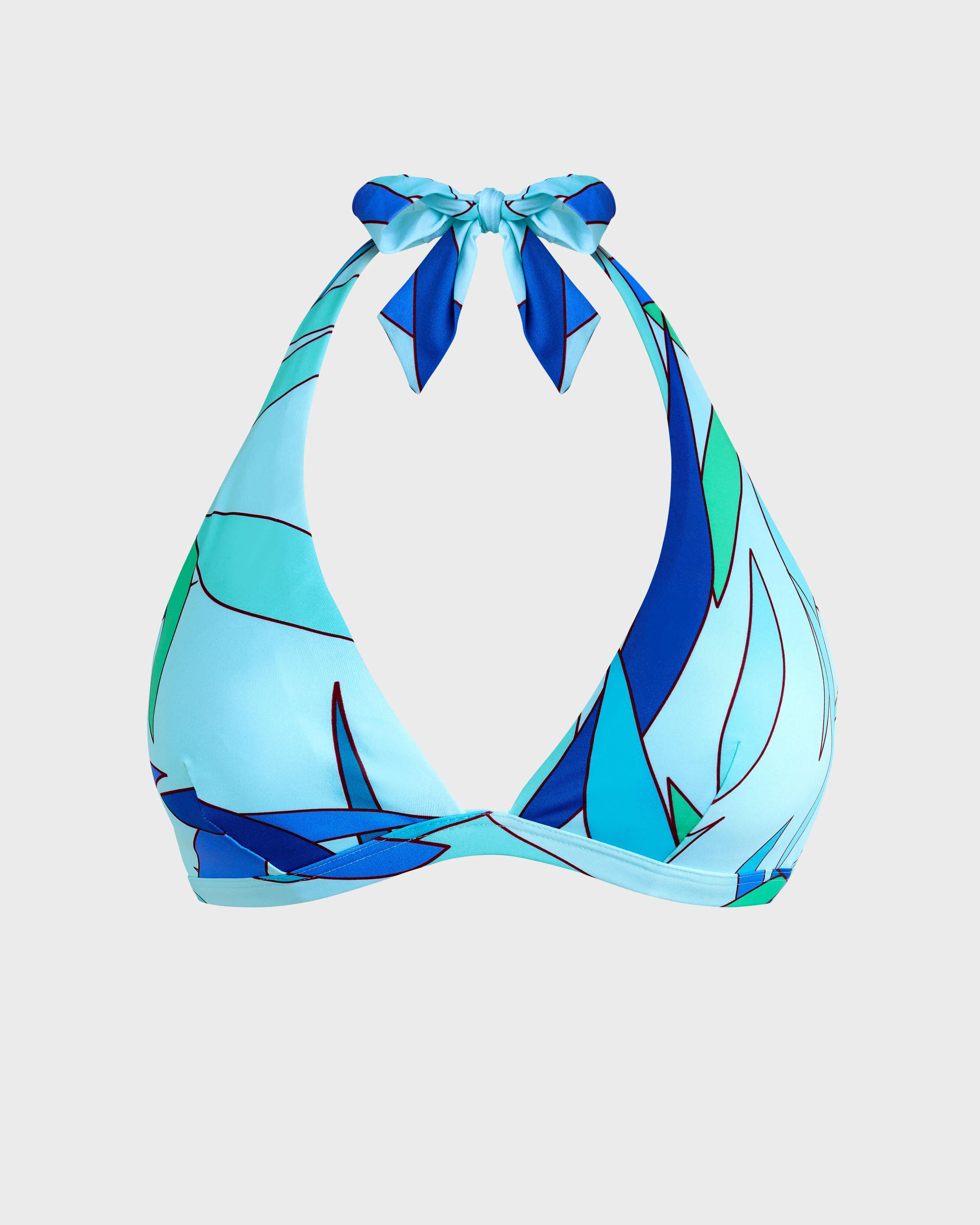 A tie-neck, printed halter bikini top offering a refined, shoulder-enhancing style. Sculpted from recycled polyamide and elastane, the removable pads provide coverage and shape. Product Information Style: Fleche Model: FLCCH144-373 Color: THALASSA / BLUE